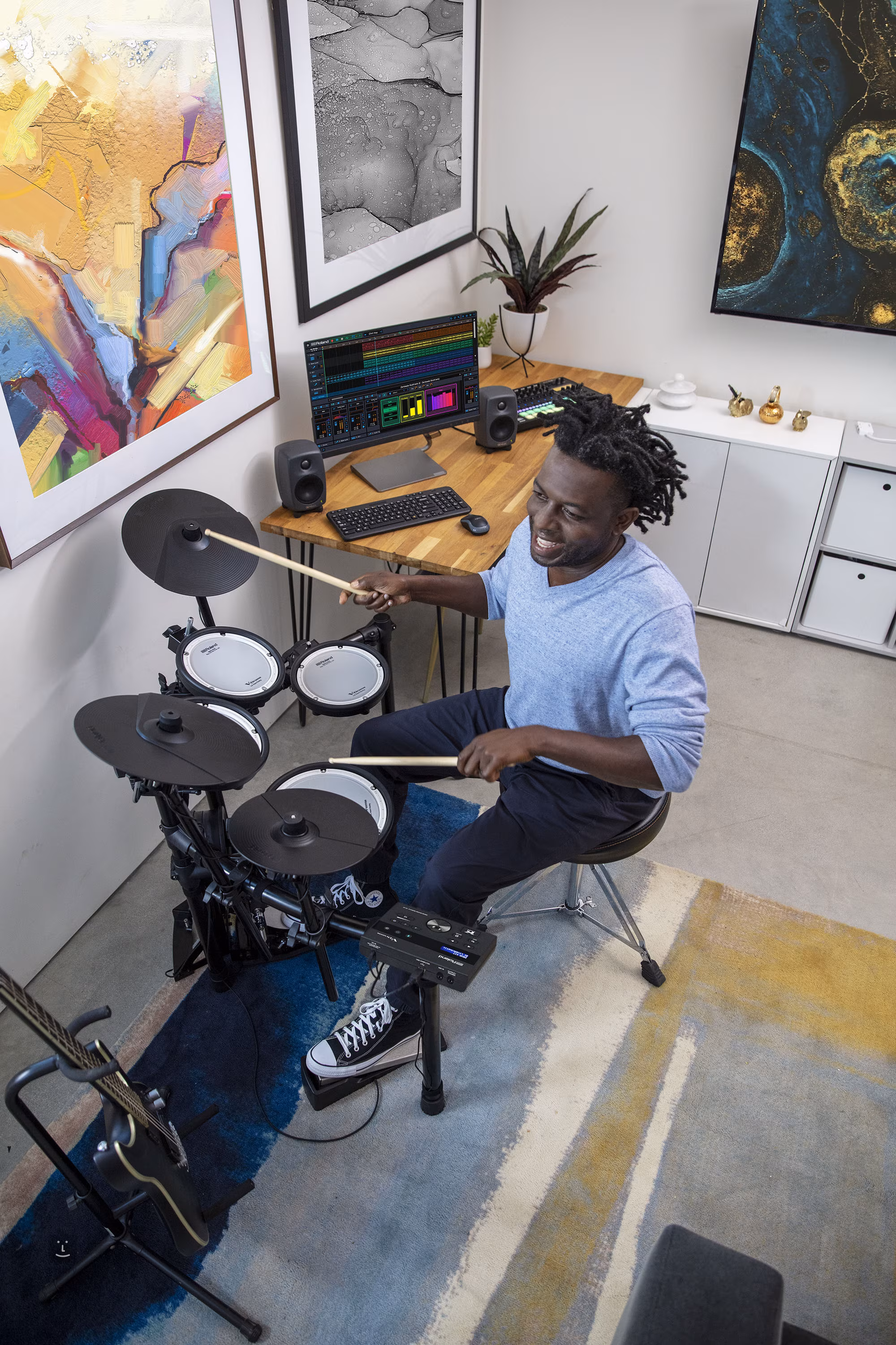 Moduł perkusyjny posiada interfejs Bluetooth do strumieniowego przesyłania muzyki lub plików MIDI ze smartfonów i tabletów, dzięki czemu można łatwo ćwiczyć, nagrywać lub grać razem z ulubioną muzyką. Oprócz tego zestawu otrzymujesz 40 darmowych lekcji w aplikacji Melodics, które można połączyć z modułem.