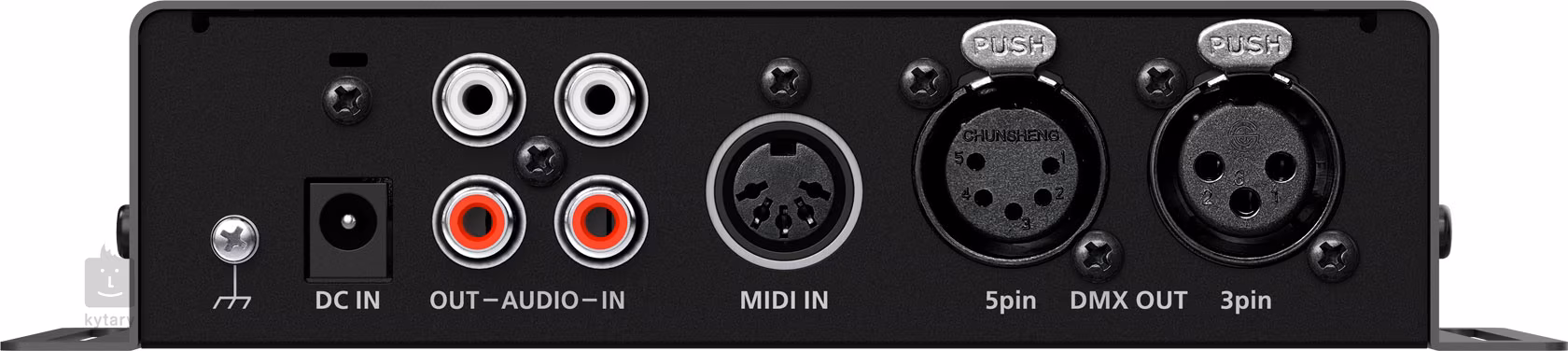 Urządzenie posiada złącze HDMI (In, Thru) z przodu oraz port USB, który może być używany do komunikacji MIDI. Tylny panel oferuje dwa wyjścia DMX (3-pinowe i 5-pinowe), jedno wejście MIDI (5-pinowe) i dwie pary złączy RCA do podłączenia sygnału audio.