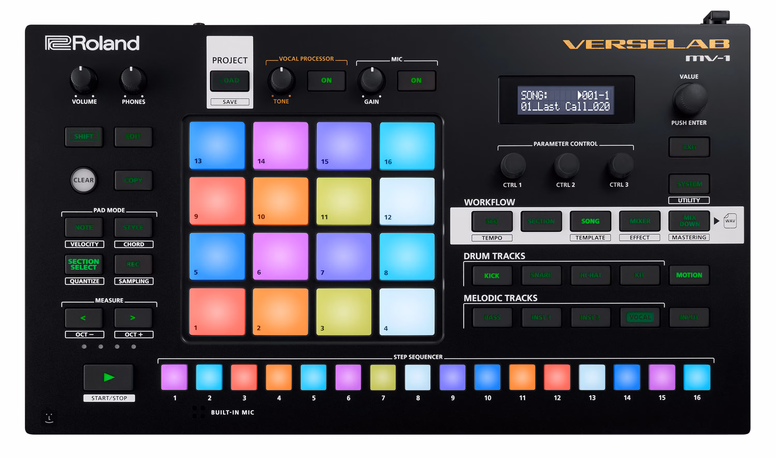Verselab MV-1 to wysokowydajna stacja produkcyjna firmy Roland, która zapewni Ci idealne środowisko do nagrywania, produkcji, miksowania i masteringu nowych utworów lub pomysłów. Twoja wyobraźnia i kreatywność będą miały swobodę działania, a dodatkowo będziesz mieć do dyspozycji aż trzy tysiące dźwięków z aplikacji ZEN-Core. Verselab MV-1 jest w pełni kompatybilny z komputerem stacjonarnym, laptopem, tabletem lub smartfonem, będzie po prostu świetnym towarzyszem podróży. Nie parzę kawy, ale poza tym pracuję jak wół... To urządzenie naprawdę zajmie się wszystkim, możesz tworzyć nowe ścieżki, sample, miksować nagrania i stosować różne nowoczesne efekty studyjnej jakości, takie jak: Auto-Pitch, Harmonizer i Doubler. Do dyspozycji będziesz mieć 16 podświetlanych padów i 16-stopniowy sekwencer do tworzenia beatów, linii basowych i melodii. Narzędzia do pisania piosenek wprowadzą Cię w odpowiedni flow i stworzą idealne warunki do kreatywnej pracy. Verselab MV-1 może być zasilany za pomocą adaptera AC (w zestawie), baterii mobilnej lub portu USB. Co znajdziesz w środku? Oprócz intuicyjnego panelu sterowania, Verselab MV-1 zawiera również zintegrowany mikrofon i przejrzysty wyświetlacz tekstowy do szczegółowej konfiguracji dźwięków lub wywołania fabrycznych lub użytkowych presetów. Maksymalny komfort zapewnia elastyczna łączność w postaci dwóch wyjść słuchawkowych do szczegółowego monitorowania, wyjścia stereo do podłączenia do monitorów studyjnych lub PA, wejścia XLR z zasilaniem fantomowym dla mikrofonów pojemnościowych lub dwóch wejść liniowych. Transmisja cyfrowa odbywa się następnie poprzez złącze MIDI In/Out i port USB. Nagrania można zapisywać na karcie pamięci SD/SDHC (dołączonej do zestawu) za pomocą gniazda znajdującego się z tyłu urządzenia.