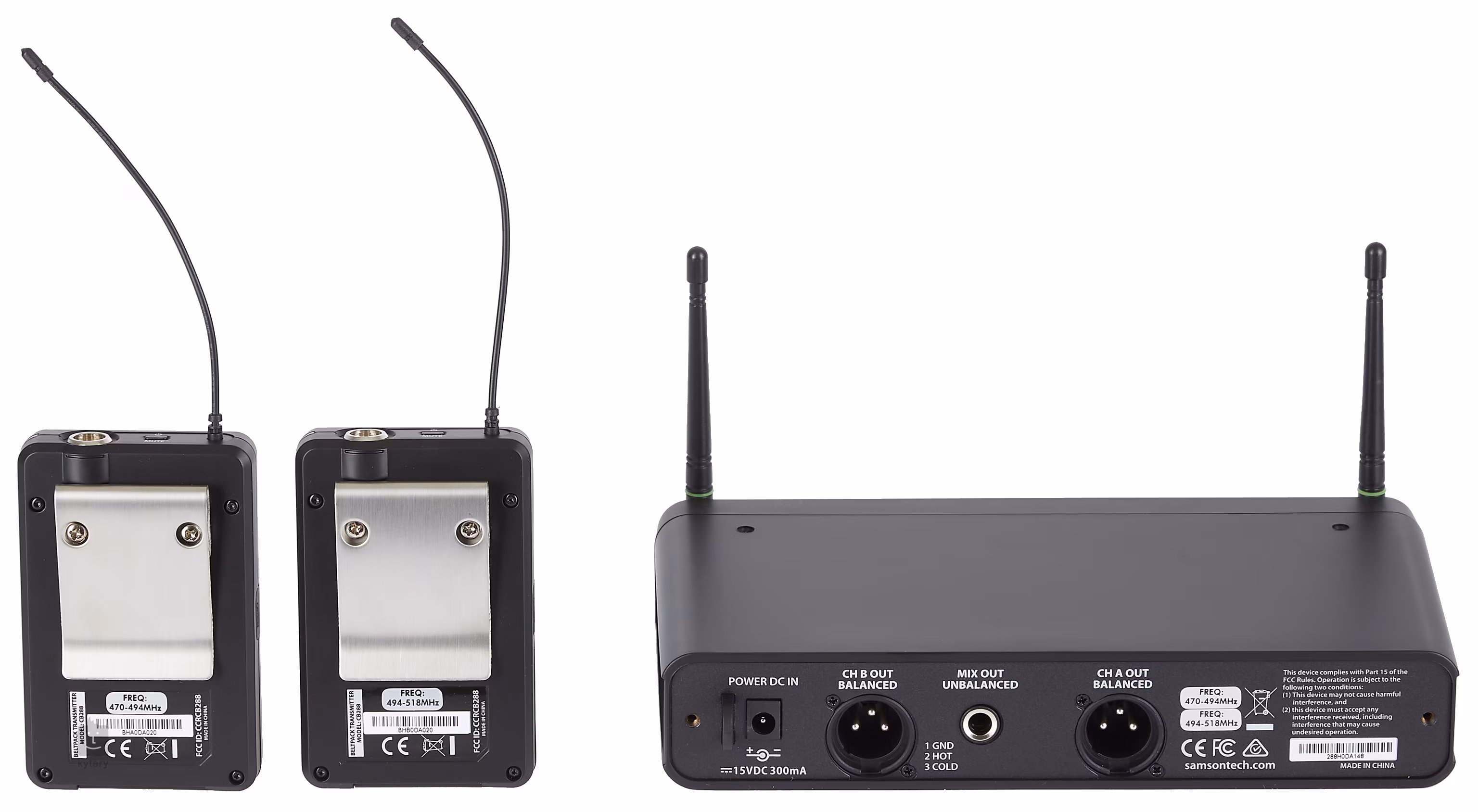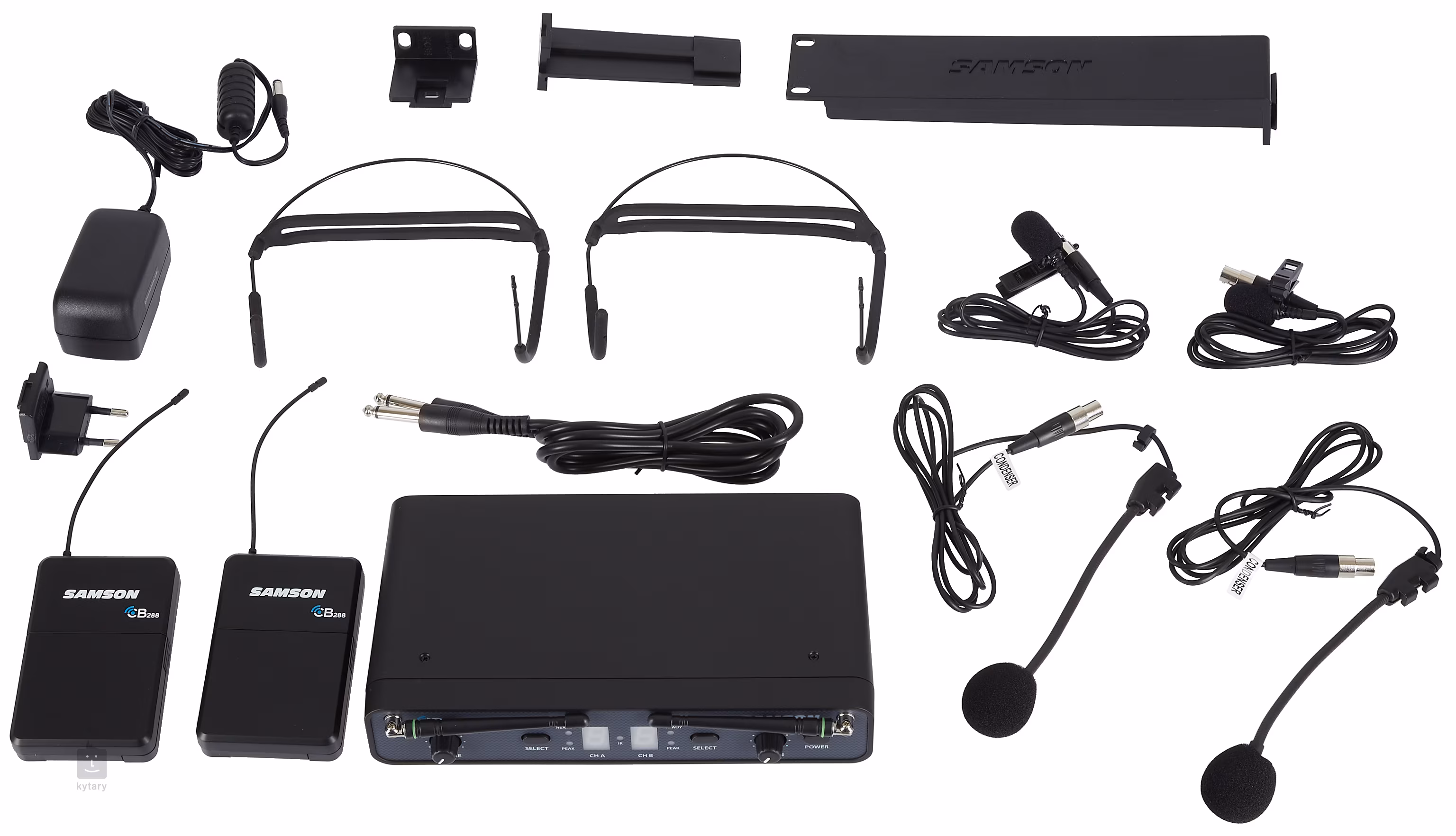 W zestawie znajduje się odbiornik CR288, nadajnik CB288, nadajnik CH288, mikrofon HS5, mikrofon klapowy LM5, kabel Jack 6,3 na Jack 6,3, zasilacz i uchwyty do montażu w szafie rack.