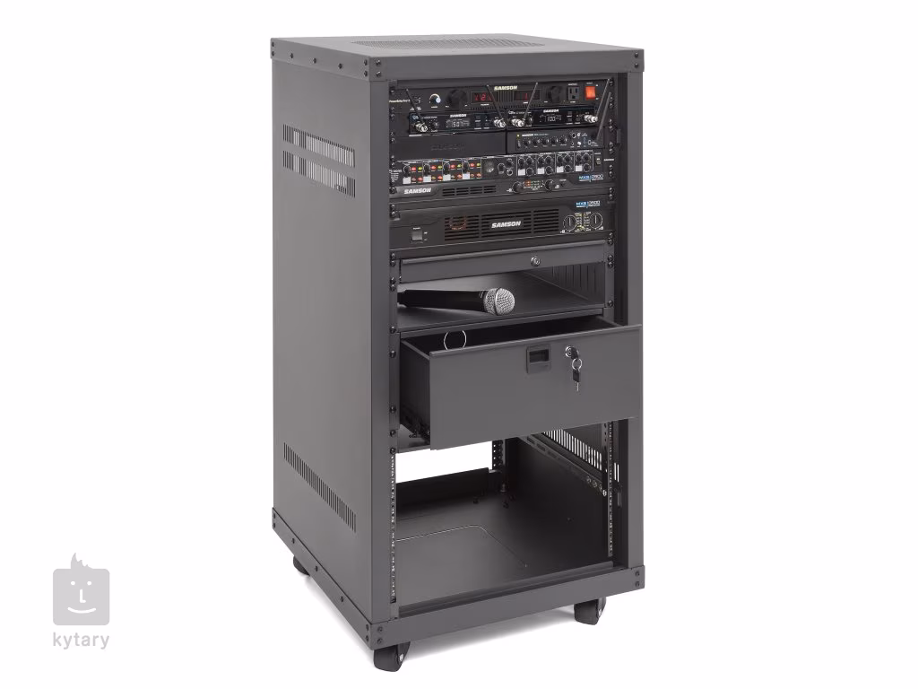 Uniwersalny stojak do bagażnika, pozwala na regulację szyn bagażnika w czterech pozycjach. W zestawie z Samson SRK Pro 8 znajdują się cztery kółka dla zwiększenia mobilności oraz nóżki do montażu na stałe. Regał o wymiarach (48,3 x 57,8 x 61 cm) ma nośność do 200 kg. Regały Samson SRK Pro są dostarczane bez drzwi.