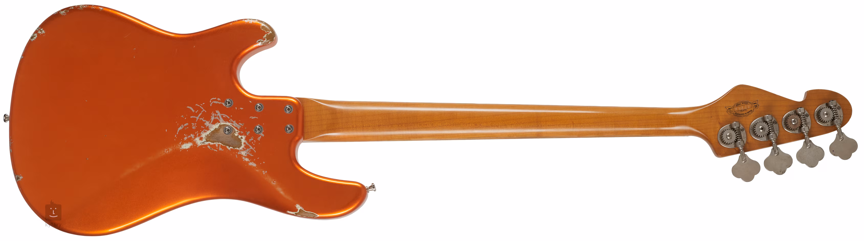 Korpus basu California V Passive HCA OM MPF RO z drewna olchowego zdobi wykończenie Orange Metallic z wyraźnymi elementami sztucznej patyny w postaci zadrapań i odprysków lakieru. Szyjka i podstrunnica instrumentu są wykonane z pieczonego klonu, dzięki czemu drewno jest bardziej stabilne i lepiej wygląda. Podstrunnica jest wyposażona w dwadzieścia dwa progi i stylowe oznaczenia pozycji.