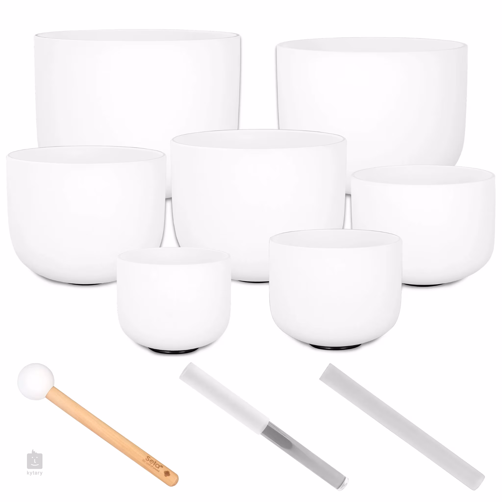 W zestawie znajdują się trzy młotki zaprojektowane specjalnie do szklanych mis: jeden drewniany młotek z gumową główką i dwa szklane pałeczki do pocierania (jeden częściowo, a drugi całkowicie pokryty silikonem). Pozwalają one na różne techniki gry, od delikatnego uderzania po ciche wibracje podczas pocierania o krawędź. W rezultacie z misek można uzyskać szeroki zakres dźwięków w zależności od intensywności i sposobu gry.