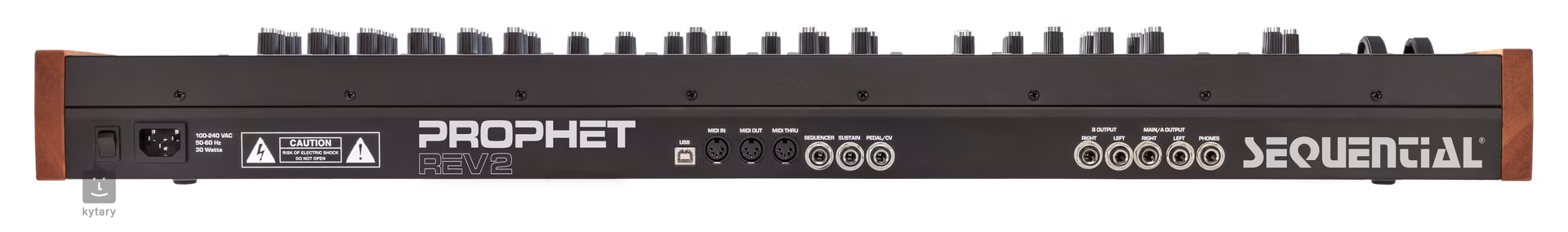Na tylnym panelu znajdziemy interfejs MIDI (In, Out, Thru), USB do dwukierunkowej komunikacji MIDI, dwa wejścia dla zewnętrznego przełącznika nożnego (Sequence, Sustain), jedno wejście dla pedału lub CV oraz sekcję wyjść audio (Output A - L, R, Output B - L, R). Oczywiście jest też wyjście słuchawkowe. Do zasilania służy wyjście IEC o uniwersalnym napięciu 100-240 V (zasilacz w zestawie).