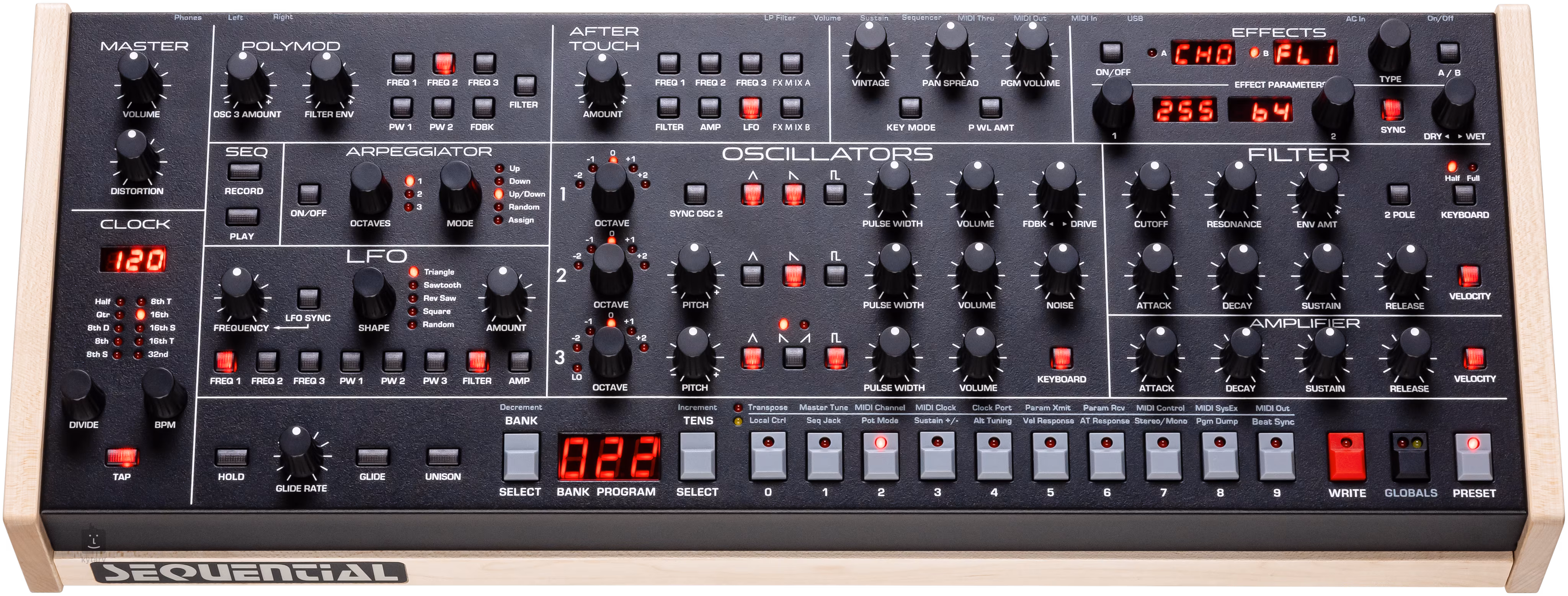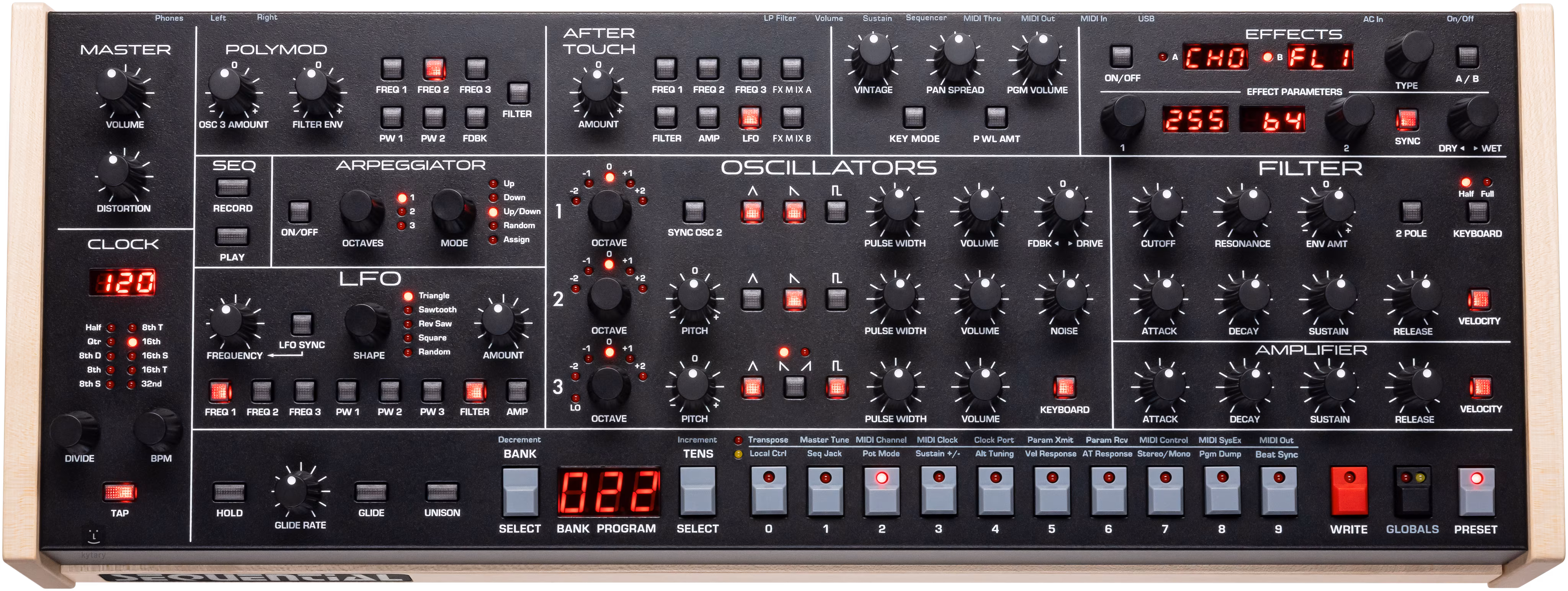 1x MIDI in, 1x USB-B (bi-directional), 2x Footswitch (Sustain, Sequence), 2x Expression pedal (Volume, LP Filter)