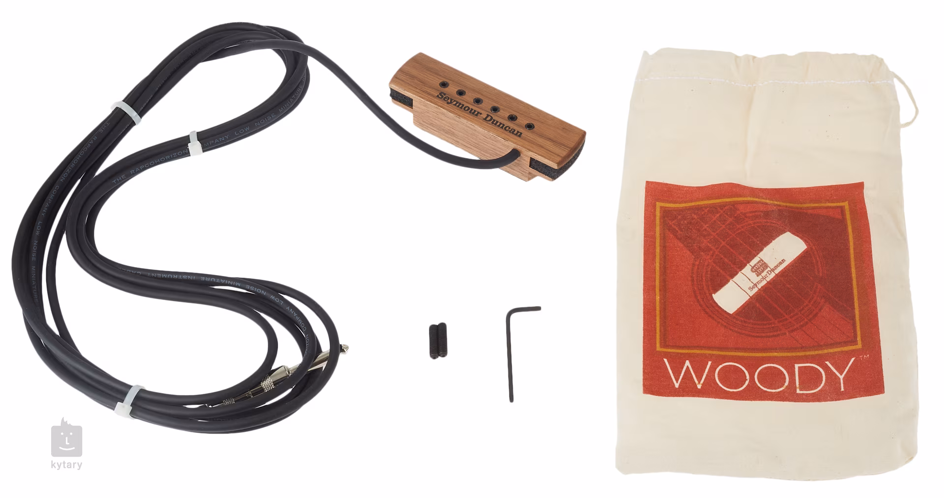 Przetworniki Seymour Duncan z serii Woody są przeznaczone do gitar akustycznych. Są to przetworniki elektromagnetyczne, które można łatwo zamontować w otworze dźwiękowym i natychmiast rozpocząć grę na sprzęcie lub nagrywanie. Oprócz oferowania wysokiej jakości brzmienia, zachwycają również luksusowym designem z drewnianym korpusem. Woody można zamontować na gitarach o średnicy otworu dźwiękowego od 94 do 100 milimetrów. Oczywiście w zestawie znajduje się kabel o długości 14 stóp, czyli 4,25 m, zakończony standardowym wtykiem gitarowym 1/4".