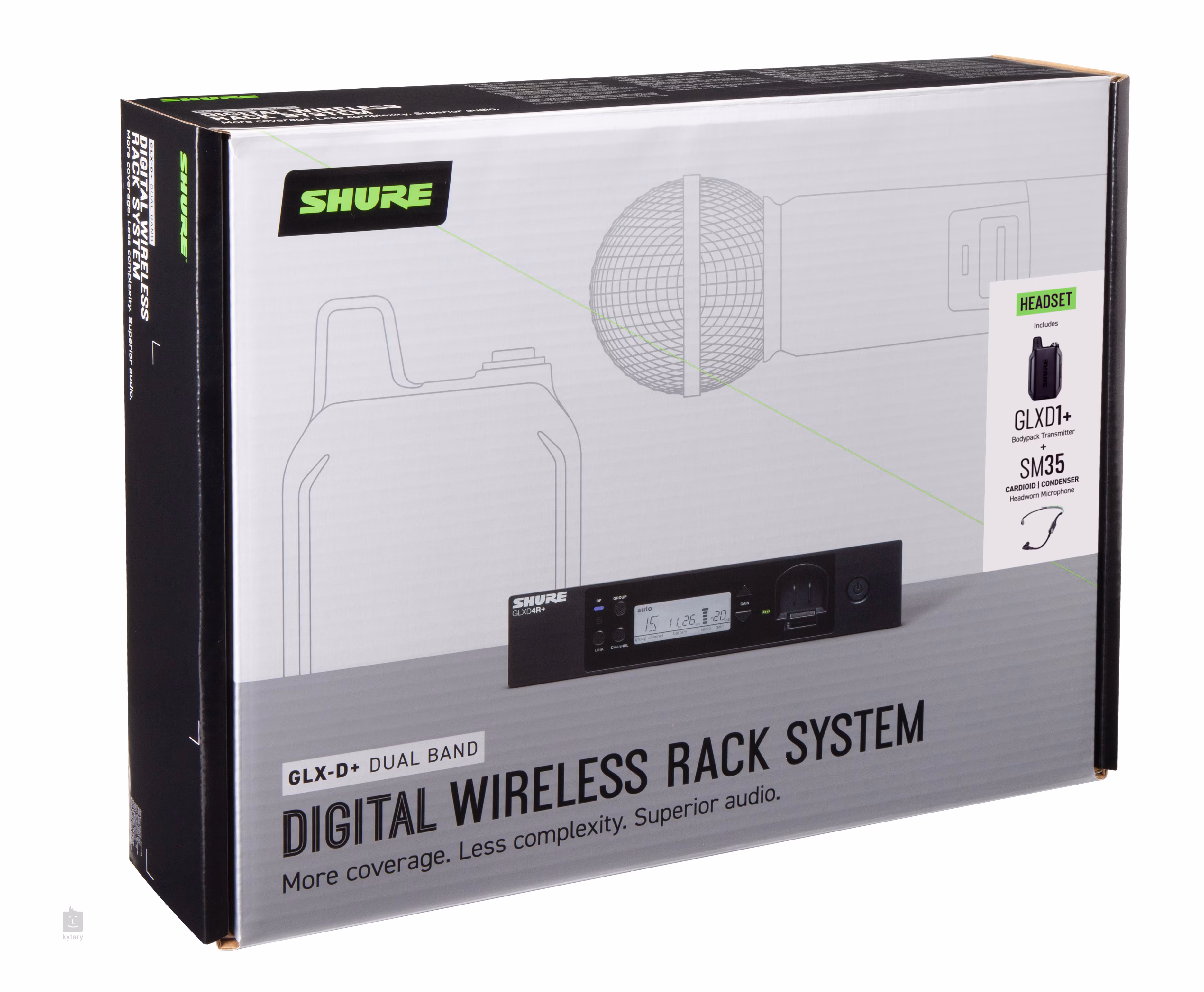 Zestaw bezprzewodowy GLXD14R+ HEADSET SYSTEM W/SM35 zawiera pojemnościowy mikrofon nagłowny SM35, nadajnik bodypack GLXD1+ oraz odbiornik do montażu w racku GLXD4R+.