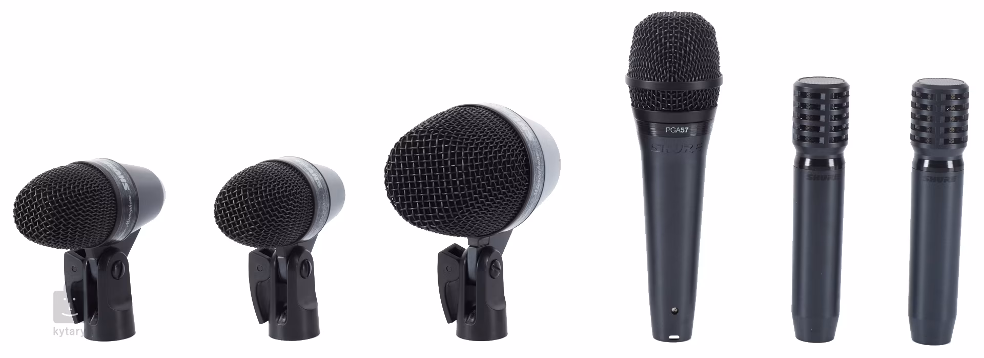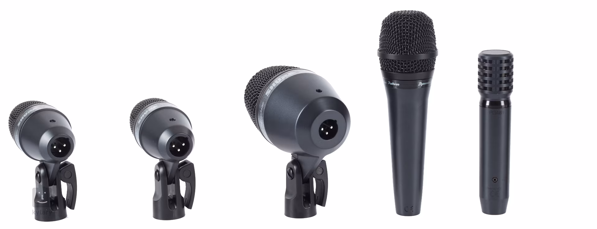 Kompaktowy zestaw mikrofonowy do nagłośnienia zestawu perkusyjnego.