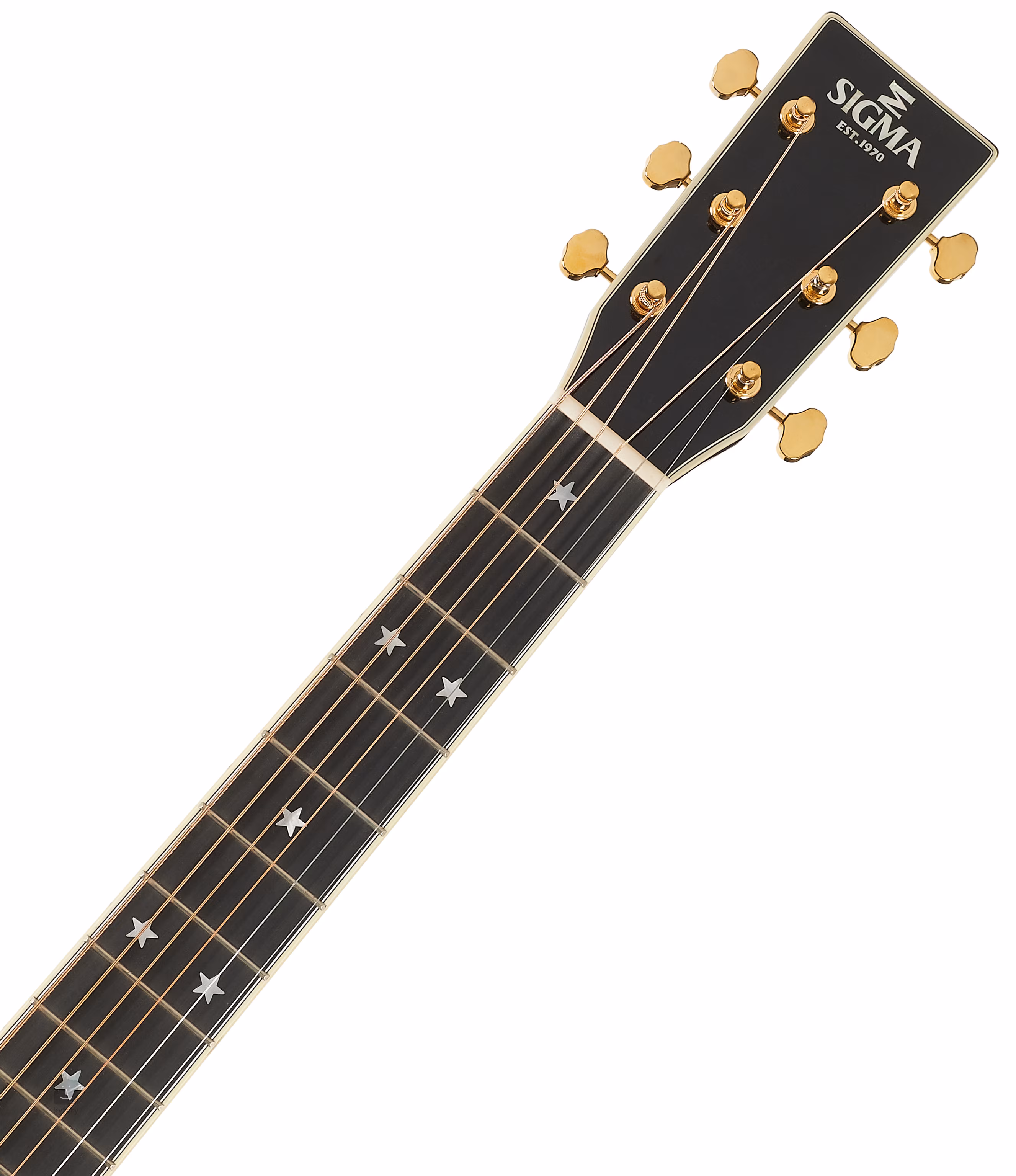 Sigma DT-42 Nashville to półmasywna gitara elektroakustyczna typu Dreadnought ze specjalnej edycji marki, która dzięki jakości wykonania oraz właściwościom dźwiękowym i grywalności zadowoli nawet najbardziej wymagających muzyków. Przednia płyta gitary jest wykonana z litego świerku Sitka, tylna płyta i boki z sklejki lipowej. Dzięki temu gitara ma dźwięczny, zrównoważony częstotliwościowo dźwięk i dobrą dynamikę zarówno przy energicznej, jak i bardzo cichej, delikatnej grze. Do mahoniowego gryfu, standardowo przymocowanego do korpusu za pomocą kołka (Dovetail Neck Joint) na czternastym progu, przyklejono podstrunnicę z kompozytu micarta. Orientację na powierzchni podstrunnicy ułatwiają ozdobne znaczniki pozycji. O brzmienie gitary dba przedwzmacniacz Fishman Sonitone z elementami sterującymi Volume i Tone, dyskretnie umieszczonymi w otworze rezonansowym instrumentu. Struny są zamocowane w wysokiej jakości otwartych mechanizmach Grover w złotym wykonaniu z kołkami Butterbean i w mostku z micarty. Progi zerowe i kompensowane siodełko z kości gwarantują idealne przenoszenie drgań strun. Ładne wykończenie podkreśla wypolerowana, błyszcząca powierzchnia czarnego korpusu, biała obwódka korpusu uzupełniona ozdobną wkładką, rozeta złożona z perłowych pierścieni, dekoracja tylnej płyty i logo firmy na główce instrumentu. Gitara jest dostarczana w praktycznym futerale.