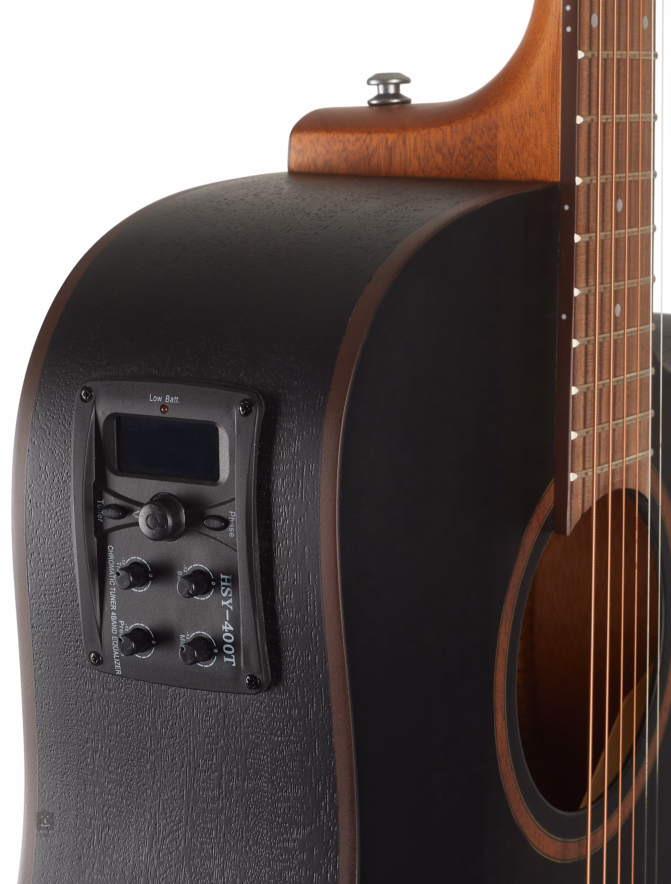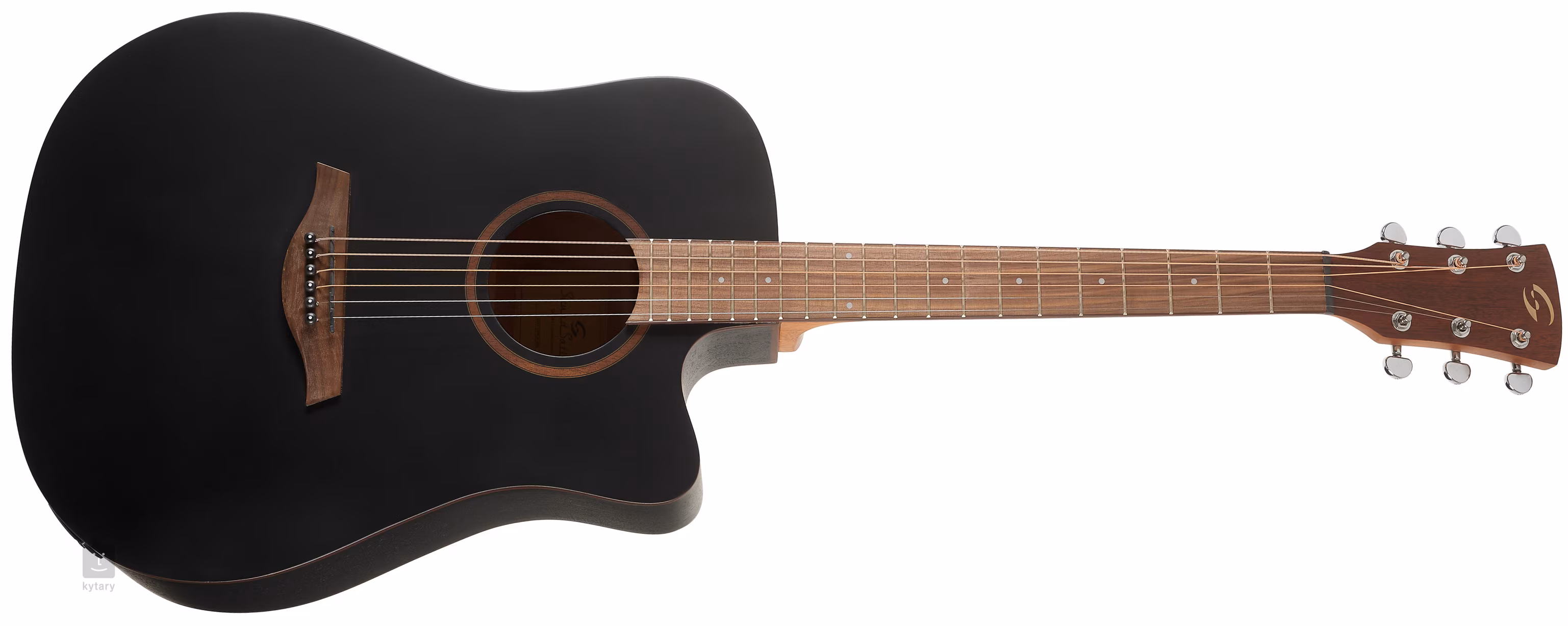 Gitara elektroakustyczna CODY DNCE-BK posiada top ze sklejki świerkowej, tył i boki ze sklejki sapele, szyjkę okoumé z ładnym profilem C, podstrunnicę z orzecha włoskiego z 20 progami, podstrunnicę z orzecha włoskiego, chromowane odlewane tunery i czarne satynowe wykończenie z otwartymi porami.