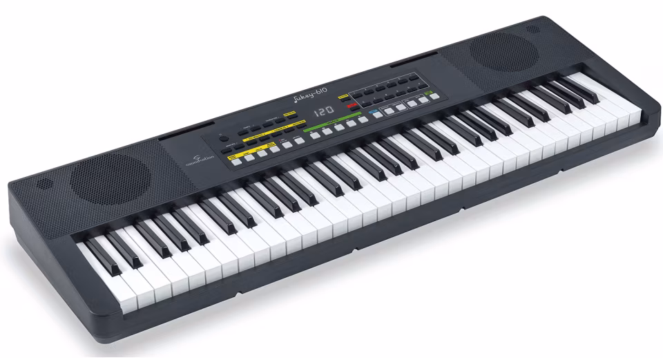 Keyboard Soundsation JUKEY-610 to idealny wybór zwłaszcza dla młodych muzyków, którzy dopiero zaczynają przygodę z instrumentami klawiszowymi. Jest wyposażony w 61 pełnowymiarowych klawiszy, które kształtem przypominają klawiaturę prawdziwego fortepianu, dzięki czemu w przyszłości nie będziesz miał problemów z nauką gry na tradycyjnym fortepianie. Na Twoje pierwsze muzyczne przygody przygotowano 300 różnych brzmień, 300 rytmów akompaniamentu i 80 utworów demonstracyjnych. Poznasz różne gatunki muzyczne i jednocześnie będziesz się świetnie bawić. Wszystkie funkcje są łatwo dostępne dzięki prostemu i intuicyjnemu panelowi sterowania. Niektóre zaawansowane funkcje, takie jak DUAL (łączenie dwóch różnych dźwięków), SPLIT (podział klawiatury na dwie strefy) i możliwość nagrywania partii, są zwykle dostępne tylko w większych keyboardach. Jednak to właśnie te możliwości niezwykle rozwijają kreatywność i sprawiają, że instrument jest bardziej zabawny. Można również dodać pedał sustain (nie wchodzi w skład zestawu), aby uzyskać bardziej autentyczne brzmienie fortepianu z zaawansowaną ekspresją. Dzięki połączeniu USB z funkcją przesyłania MIDI można grać na nowoczesnych instrumentach programowych i poszerzać horyzonty muzyczne swoje lub swojego dziecka. O nagłośnienie dba wewnętrzny wzmacniacz i zestaw dwóch zintegrowanych głośników o mocy 5 W. Kompaktowa konstrukcja, możliwość zasilania bateryjnego, wbudowany stojak na nuty i łatwość przenoszenia sprawiają, że ten keyboard jest idealnym instrumentem dla uczniów lub podróżników. W rezultacie jest to wysokiej jakości keyboard o doskonałym stosunku ceny do jakości.