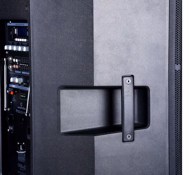 Elegancki i profesjonalny wygląd zestawu głośnikowego uzupełnia solidna polipropylenowa konstrukcja z teleskopowym uchwytem i kółkami ułatwiającymi transport. Głośnik może być używany zarówno jako element PA, jak i monitor podłogowy z możliwością ustawienia pod kątem 45° lub 25°. Skrzynka głośnikowa oferuje również różne opcje montażu, w tym standardowy otwór 36 mm do montażu na statywie i trzy punkty M8 do zawieszenia.