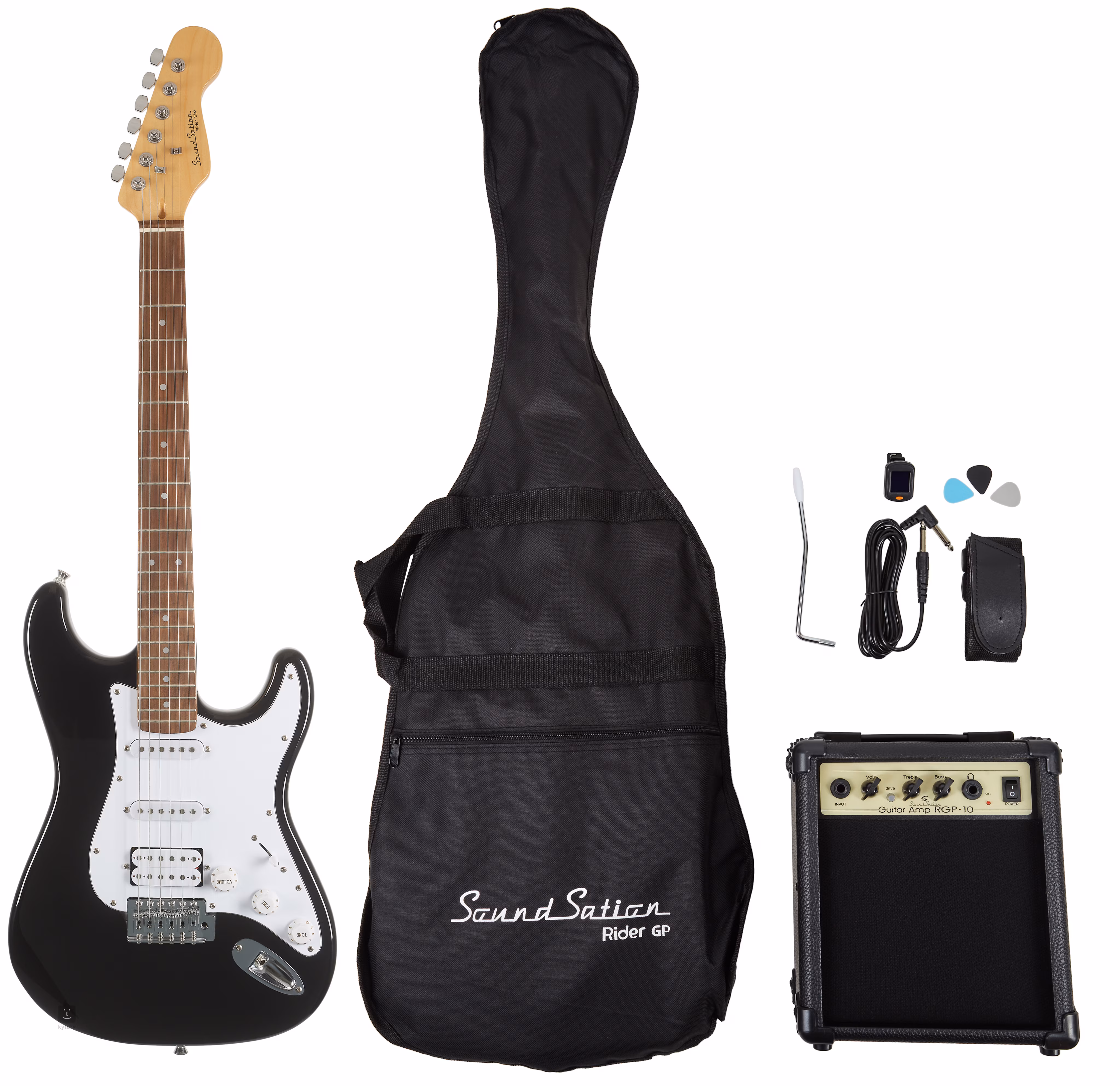 Zestaw SOUNDSATION RIDER GP BK ELECTRIC GUITAR PACK zawiera wszystko, czego potrzebują początkujący muzycy. W szczególności jest to gitara elektryczna w tradycyjnym stylu ST z trzema pojedynczymi cewkami, combo gitarowe RGB-10 o mocy 10 W z wyjściem słuchawkowym, przypinany tuner, pasek gitarowy, kabel instrumentu, kostki i torba koncertowa.