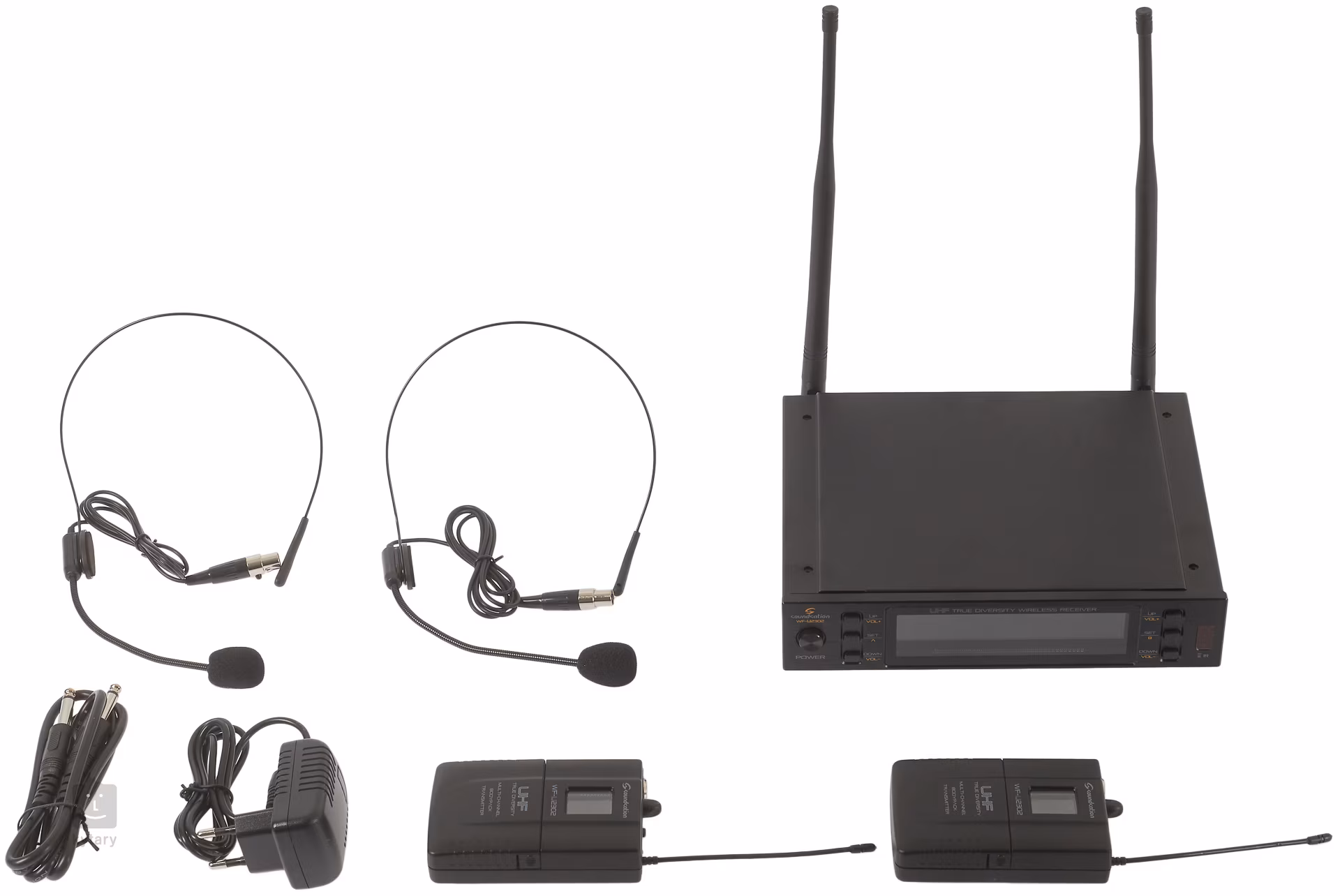 Soundsation WF-U2302PP to podwójny profesjonalny zestaw bezprzewodowy, który składa się z dwóch nadajników bodypack z dynamicznymi mikrofonami nagłownymi oraz odbiornika True Diversity UHF z 300 kanałami dla każdego nadajnika i prostym, intuicyjnym interfejsem użytkownika.