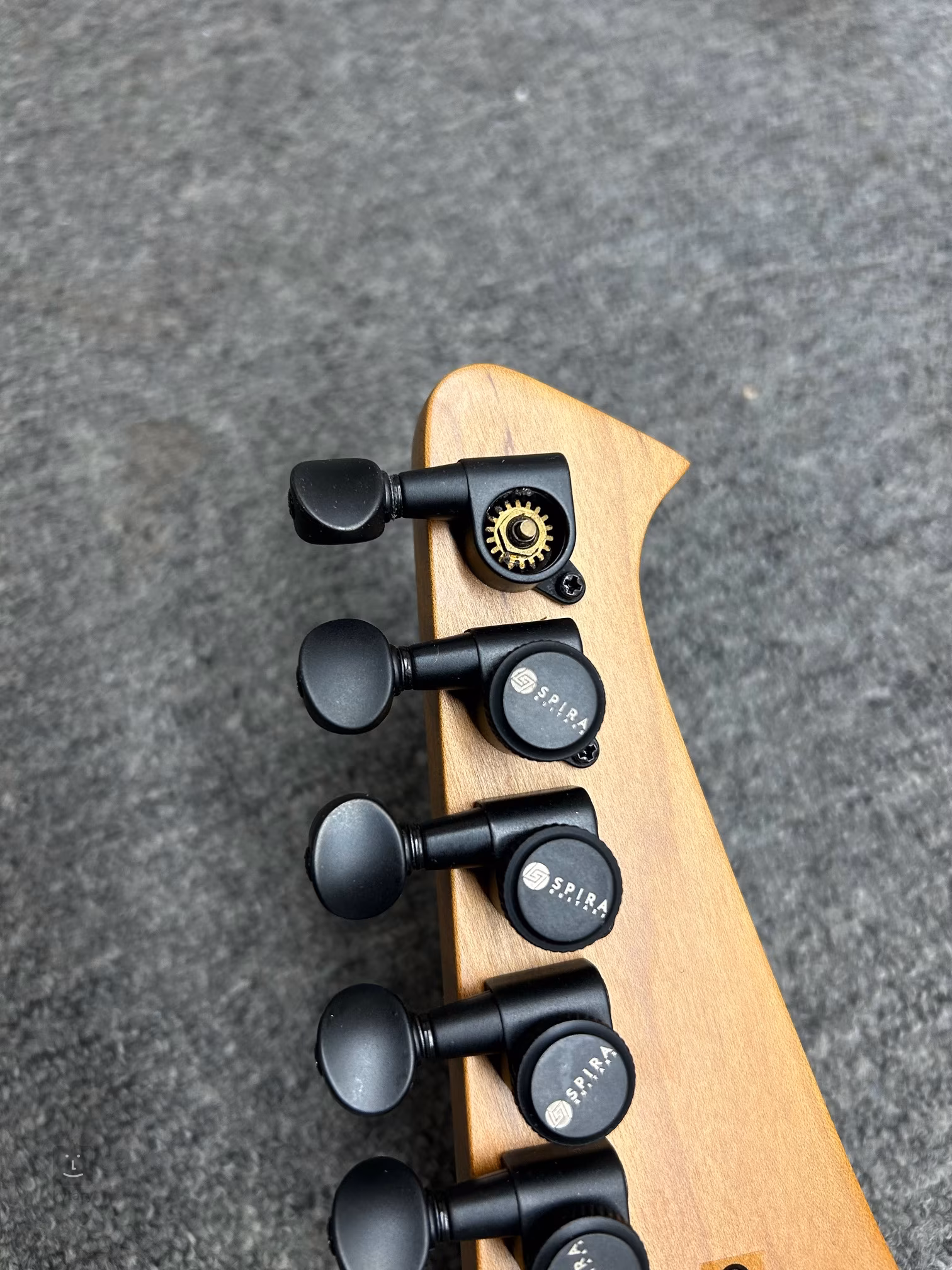 Dwa autorskie humbuckery Spira Villain z ceramicznymi magnesami i mocniejszym wyjściem nadają gitarze soczyste brzmienie, które szczególnie docenisz w ustawieniach high-gain. Ustawieniami brzmienia można manipulować za pomocą standardowych pokręteł. Struny są zamontowane w firmowej mechanice blokującej i poprzez solidny mostek przechodzą przez korpus. Stylowe wykończenie podkreśla błyszczący lakier i czarny osprzęt.