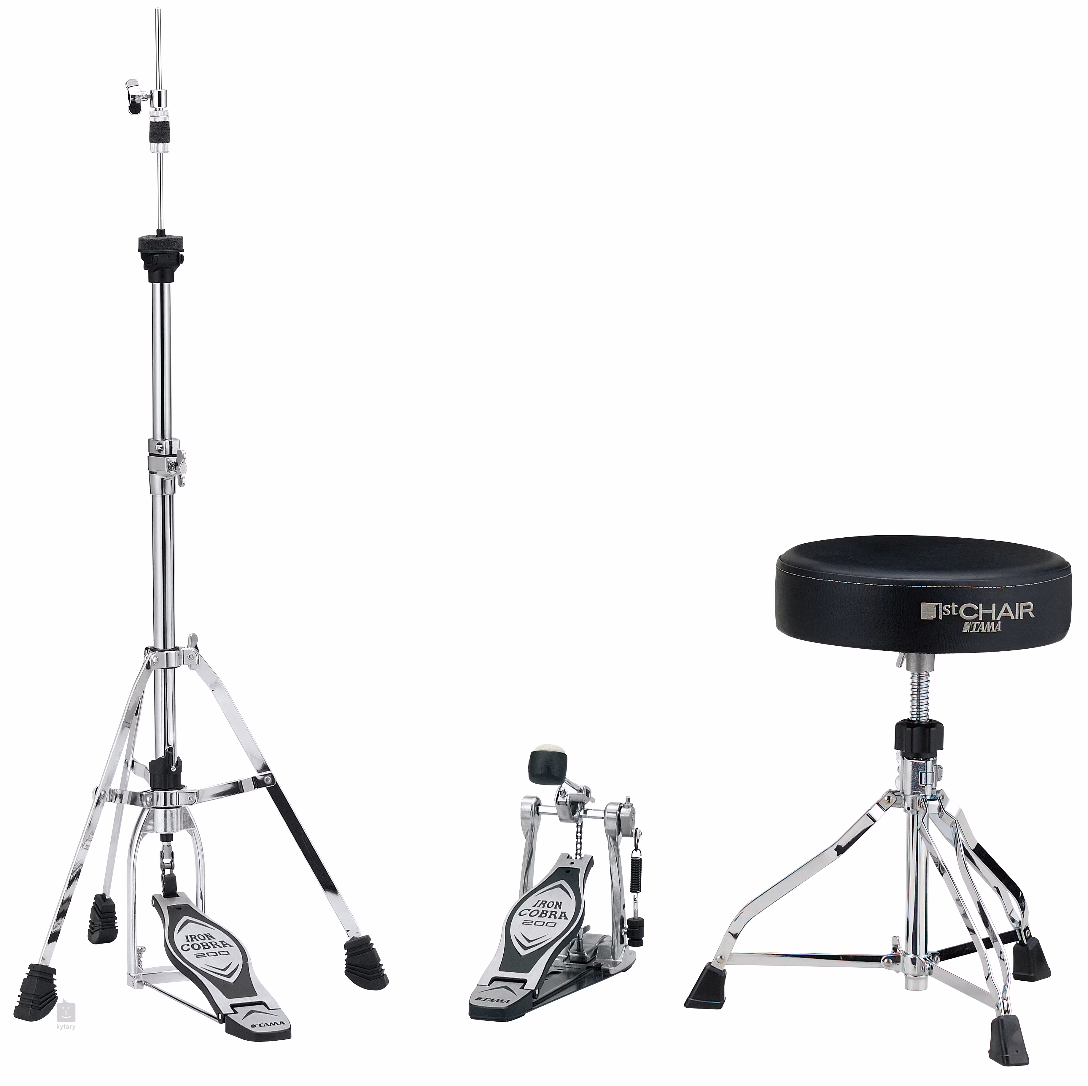 Zestaw siedzisko perkusyjne HT230 1st chair, pojedynczy pedał perkusyjny HP200P Cobra 200 Series oraz statyw Hi-Hat HH205S Iron Cobra 200 Series.