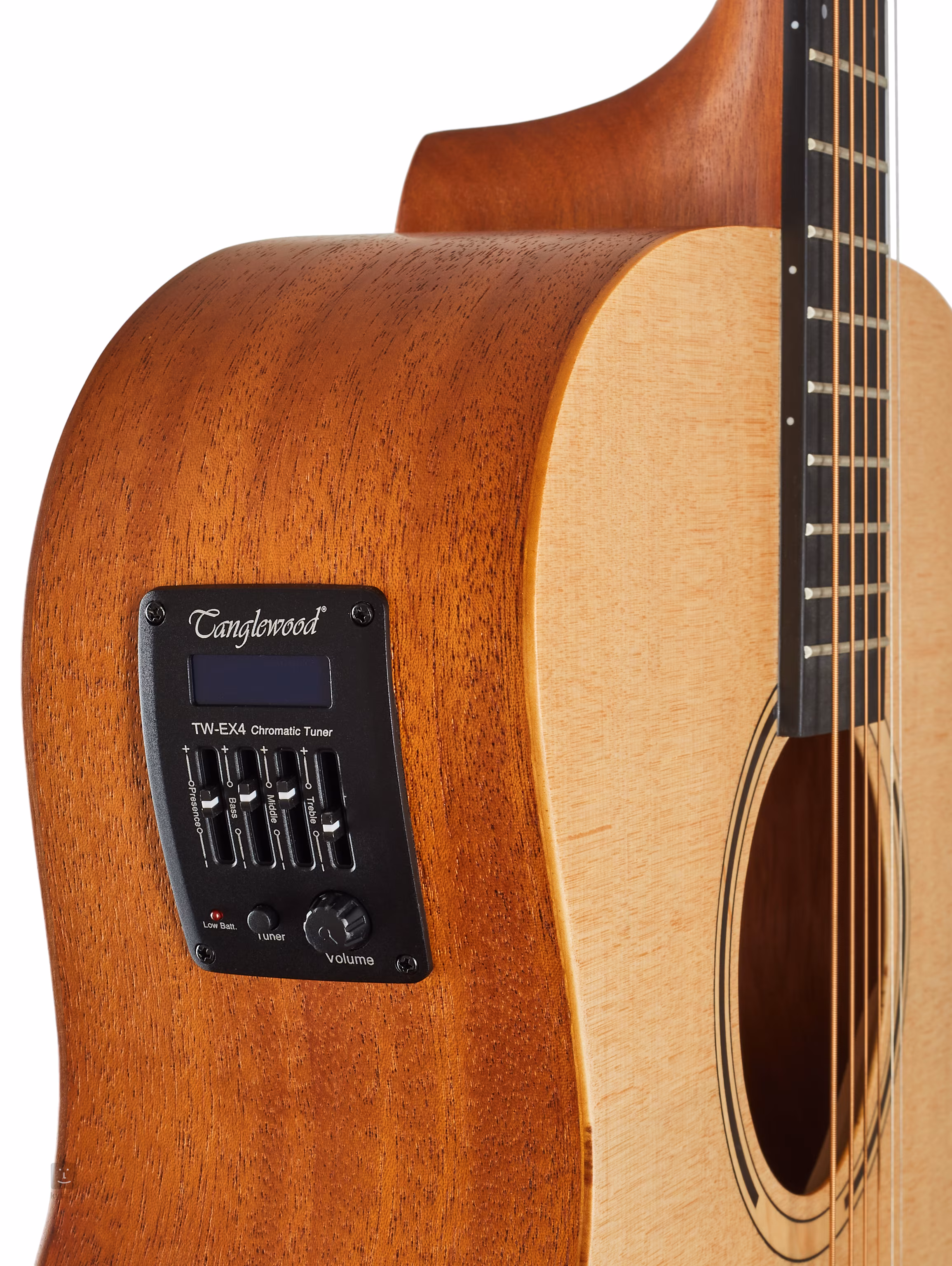 Tanglewood TR 3 E to gitara elektro-akustyczna o bardziej kompaktowym kształcie korpusu Orchestra (OM). Przód wykonany jest z laminowanego świerku, a tył i boki z laminowanego mahoniu. Mahoniowa szyjka jest przyklejona do kompozytowej hebanowej podstrunnicy z 20 progami.