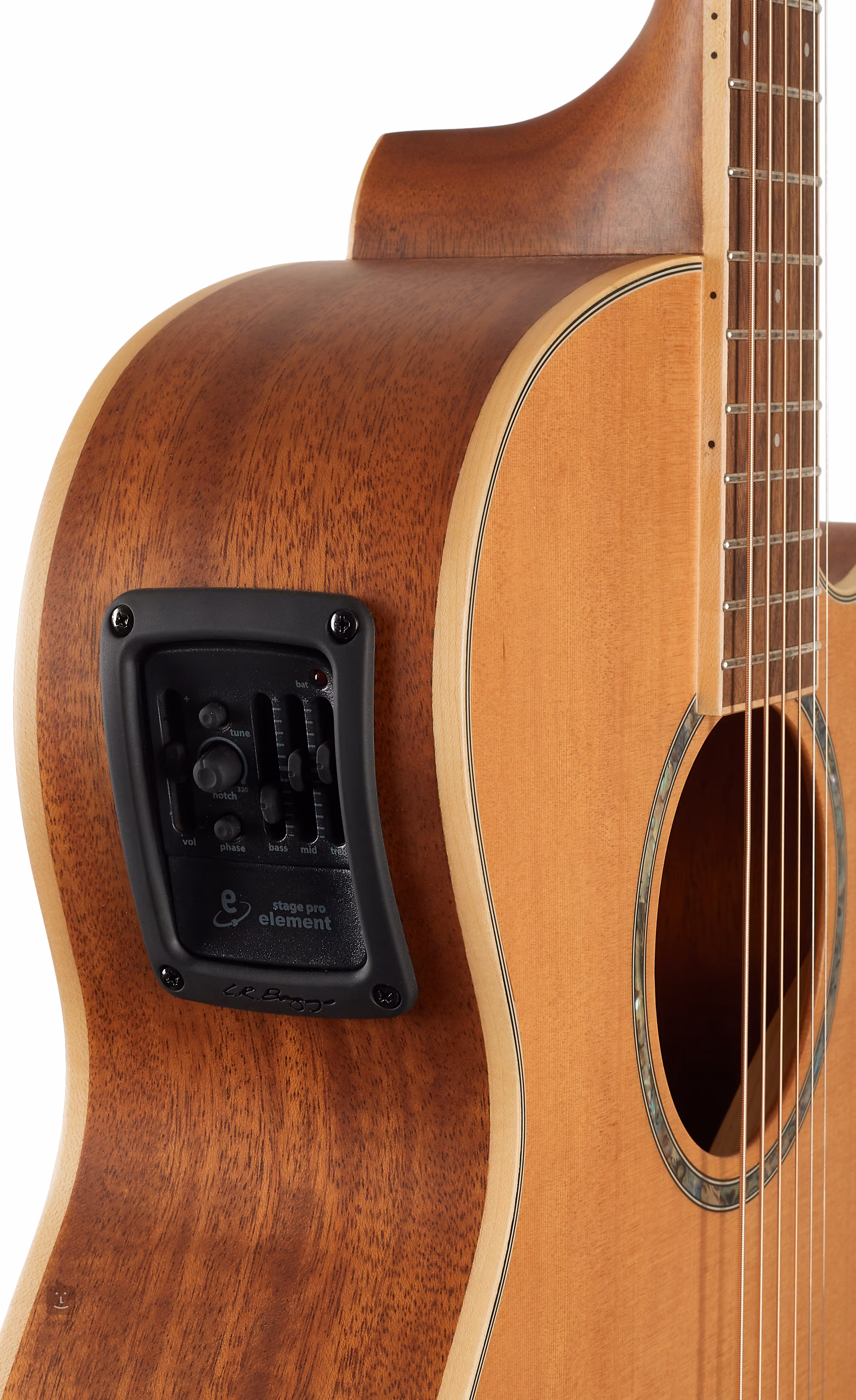 Opcje wzmocnienia dźwięku obejmują elektronikę LR Baggs Bronze z regulacją głośności, trzypasmowym korektorem, wbudowanym tunerem oraz kontrolkami Notch i Phase, aby rozwiązać wszelkie problemy związane z dźwiękiem/fazą i sprzężeniem zwrotnym.