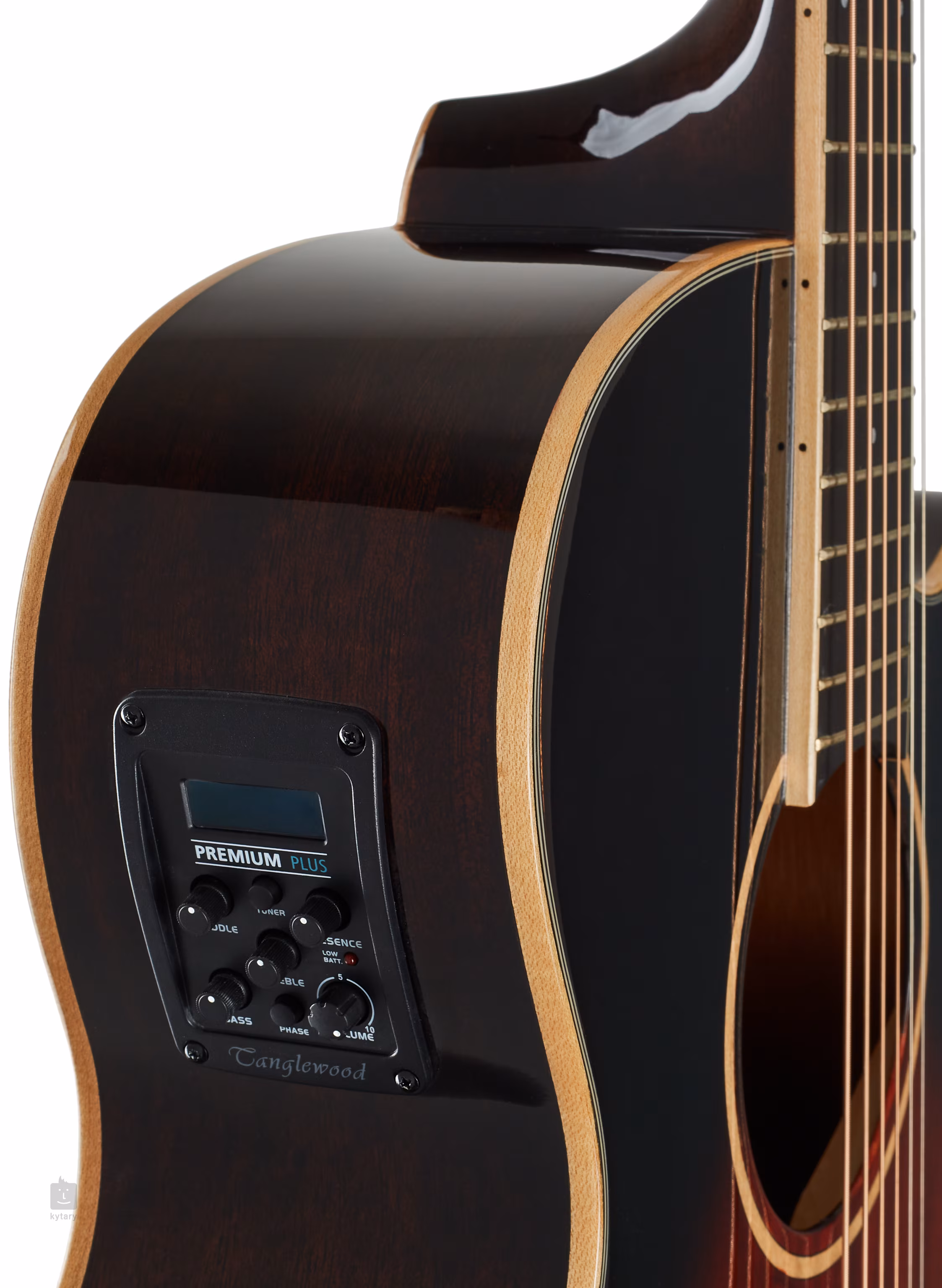Brytyjska marka Tanglewood oferuje niedrogie gitary akustyczne w stylu retro i nowoczesnym. TW4 CE AVB to gitara elektroakustyczna typu „Super Folk”, czyli instrument o węższym i płytszym korpusie niż np. Dreadnought. Korpus gitary jest wykonany z mahoniu – płyta przednia z litego drewna, płyta tylna i boki z mahoniu sklejkowego. Do szyjki z drewna zwanego „eastern mahogany” przyklejono podstrunnicę z nowoczesnego materiału kompozytowego z dwudziestoma progami. Dotyk w wyższych pozycjach gryfu ułatwia praktyczne wycięcie w dolnej części korpusu. Możliwość nagłośnienia zapewnia firmowy przedwzmacniacz TW Premium Plus z czteropasmowym korektorem, funkcją Phase i wbudowanym stroikiem. Struny są zamocowane przez zerowy i siodłowy próg z materiału NuBone w chromowanych mechanizmach die-cast marki Grover i kompozytowym mostku. Ładne wykończenie podkreśla klonowa obręcz korpusu i rozeta, środkowy pasek na tylnej płycie, perłowe kropki pozycyjne (MoP) i wykończenie przedniej płyty Autumn Vintage Gloss.