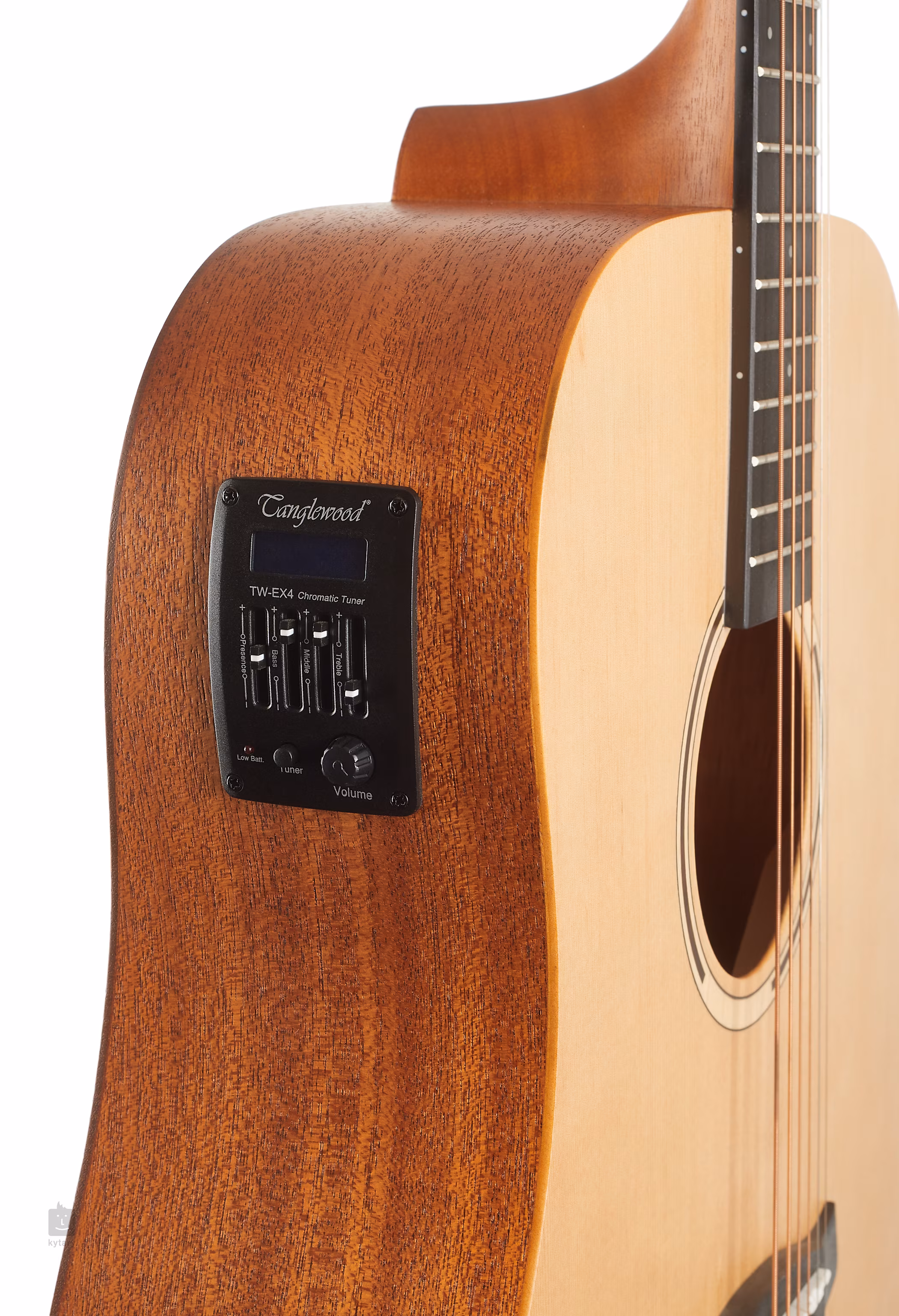 Tanglewood Roadster II TWR2 D E to gitara elektroakustyczna typu dreadnought. Przód gitary wykonany jest z laminowanego świerku kanadyjskiego, a tył i boki ze sklejki i indonezyjskiego mahoniu. Szyjka jest przymocowana do korpusu na czternastym progu, a wykończona hebanem kompozytowa powierzchnia podstrunnicy jest podzielona przez dwadzieścia progów i kropki orientacyjne.