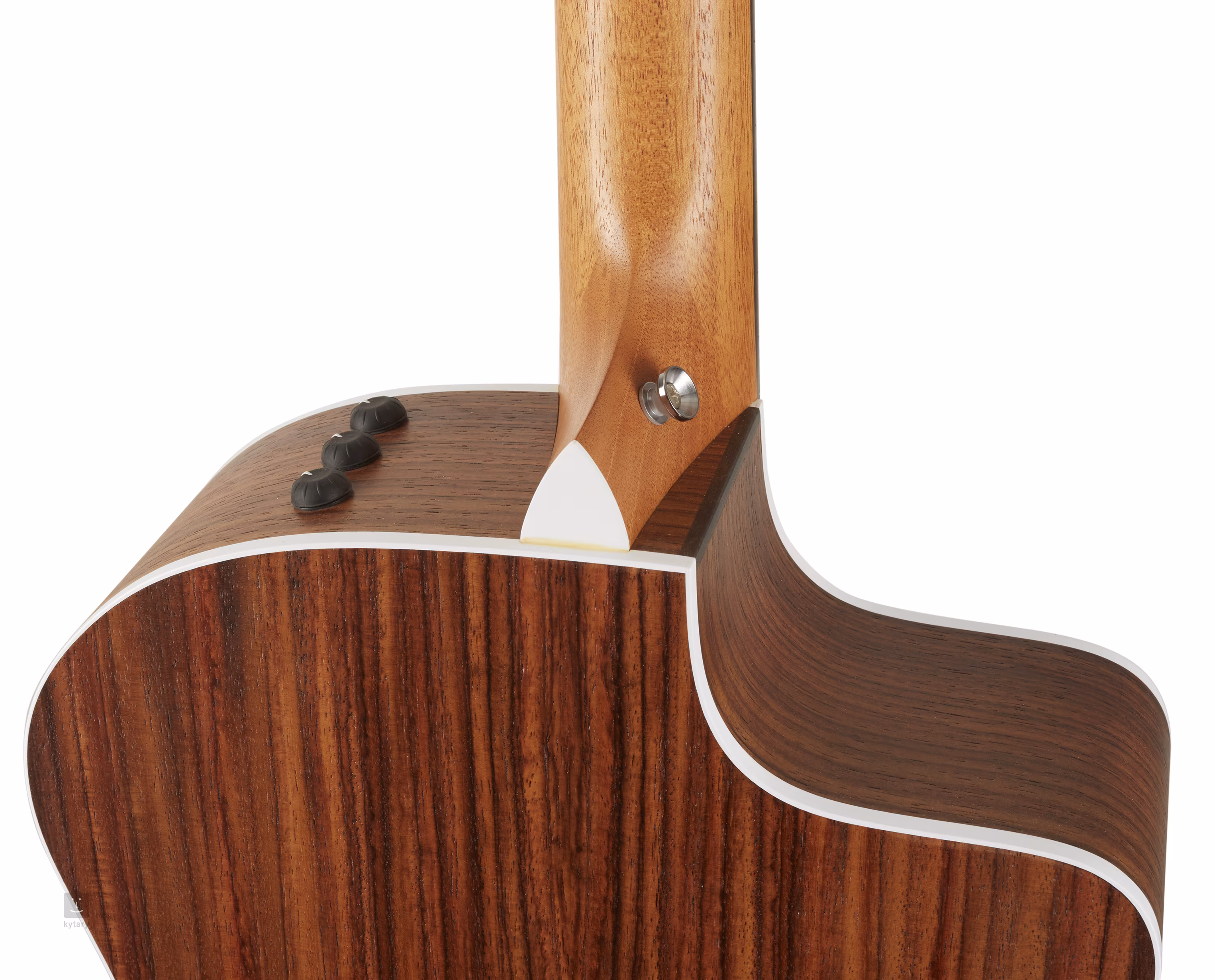 Stabilność strojenia zapewnia system NuBone zero-fret string attachment w hebanowej główce oraz chromowany mechanizm Taylor die-cast. Stylowy wygląd instrumentu podkreślają tradycyjne elementy w postaci pickguarda wykonanego z imitacji skorupy żółwia, jasnego obrzeża korpusu, rozety złożonej z czarnych i białych pierścieni oraz hebanowego forniru na główce ozdobionego logo Taylor.