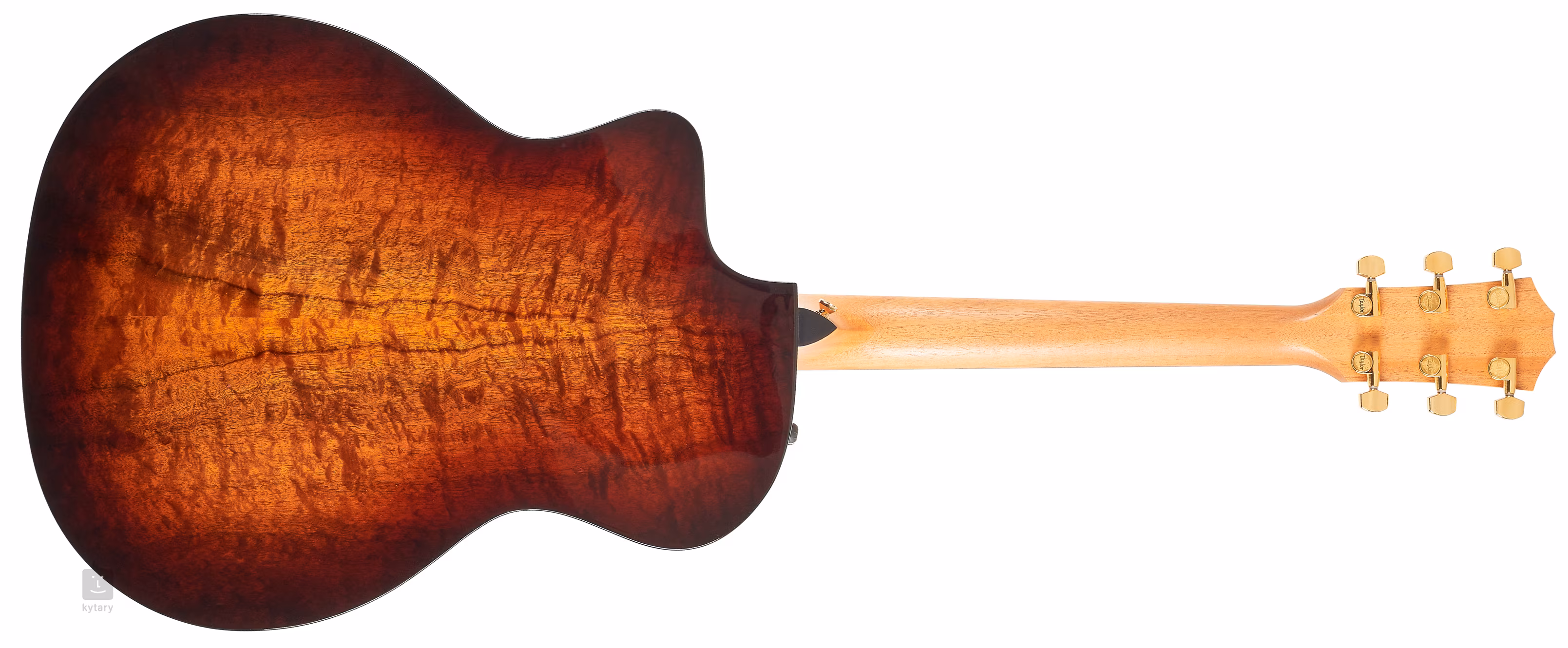 Mahoniowa szyjka jest przyklejona do hebanowej podstrunnicy wyposażonej w dwadzieścia progów. Subtelnie zaokrąglone wycięcie w dolnej części korpusu (Venetian Cutaway) ułatwia strojenie na wyższych pozycjach podstrunnicy. Stabilność strojenia gwarantuje mocowanie strun NuBone w poprzek progu zerowego w hebanowej główce i złote wykończenie Taylor. Stylowy wygląd instrumentu podkreślają tradycyjne elementy w postaci czarnego pickguardu, rozety z masy perłowej i logo firmy na główce.