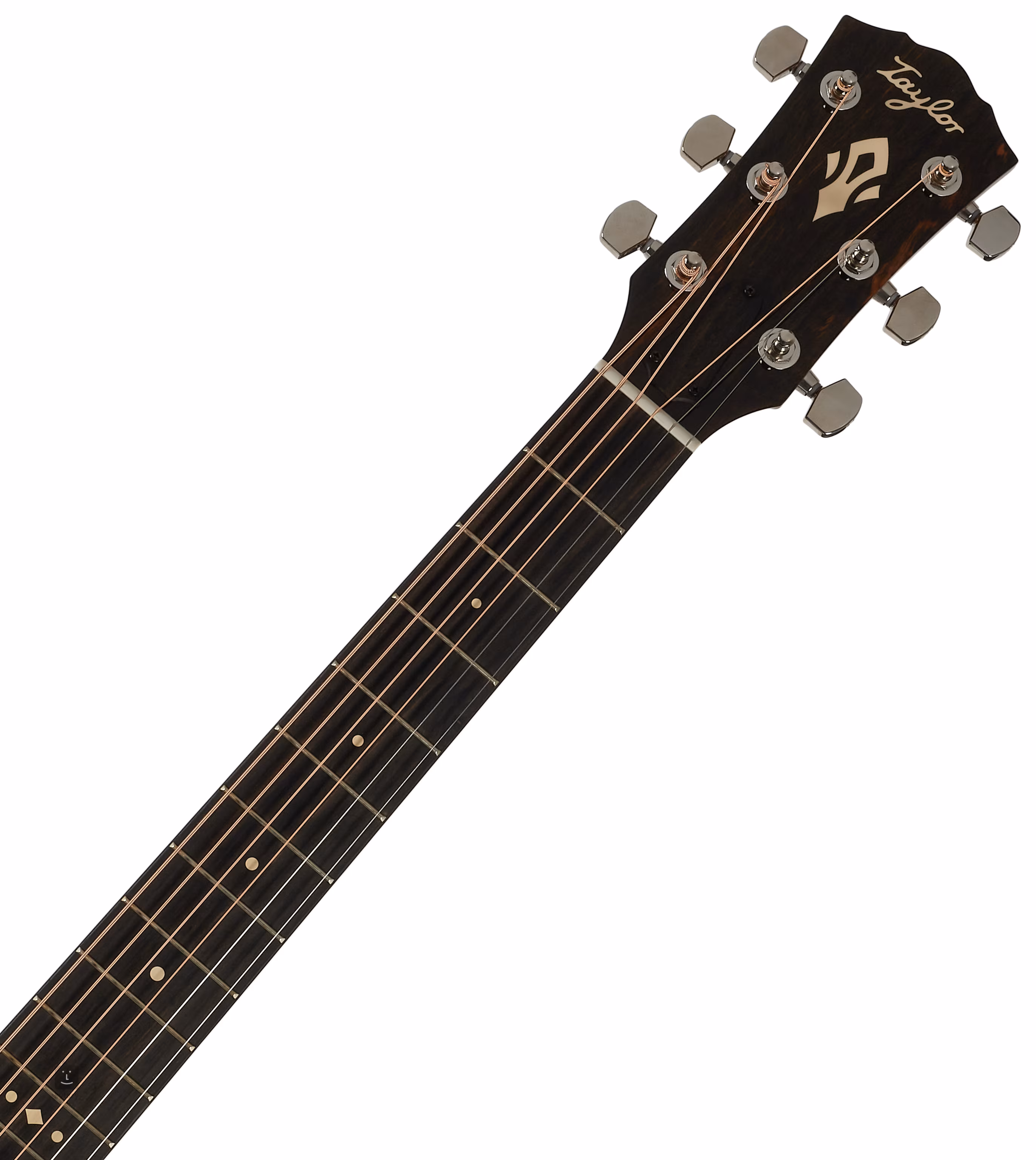 Mahoniowa szyjka jest przyklejona do hebanowej podstrunnicy wyposażonej w dwadzieścia progów. Stabilność strojenia gwarantuje mocowanie strun w ekskluzywnej podstrunnicy z palisandru honduraskiego oraz autorskie mechanizmy Taylor. Ładne wykonanie podkreśla wykończenie topu w kolorze sunburst, bindowanie na obwodzie imitujące kość słoniową, palisandrowe kołki w podstrunnicy i kremowy pickguard.