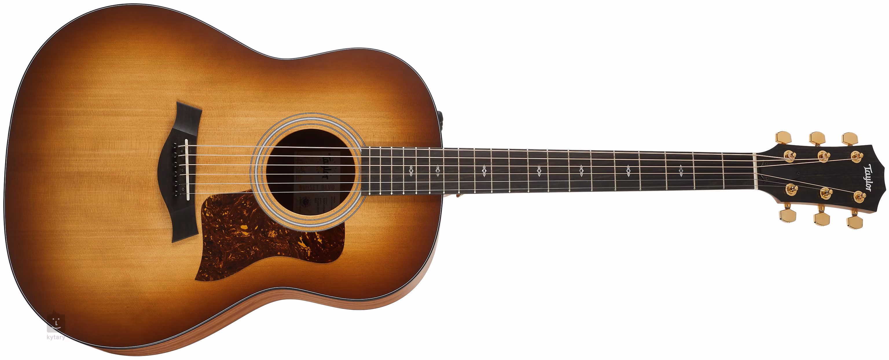 Stabilność strojenia gwarantuje mocowanie strun przez zerowy próg z materiału NuBone w hebanowym mostku i mechanizmach Taylor w złotym wykończeniu. Stylowy wygląd instrumentu podkreśla złociste wykończenie Sunset Edgeburst przedniej płyty, czarna obwódka korpusu, ozdobne znaczniki pozycji z imitacji masy perłowej i pickguard z imitacji szylkretu.