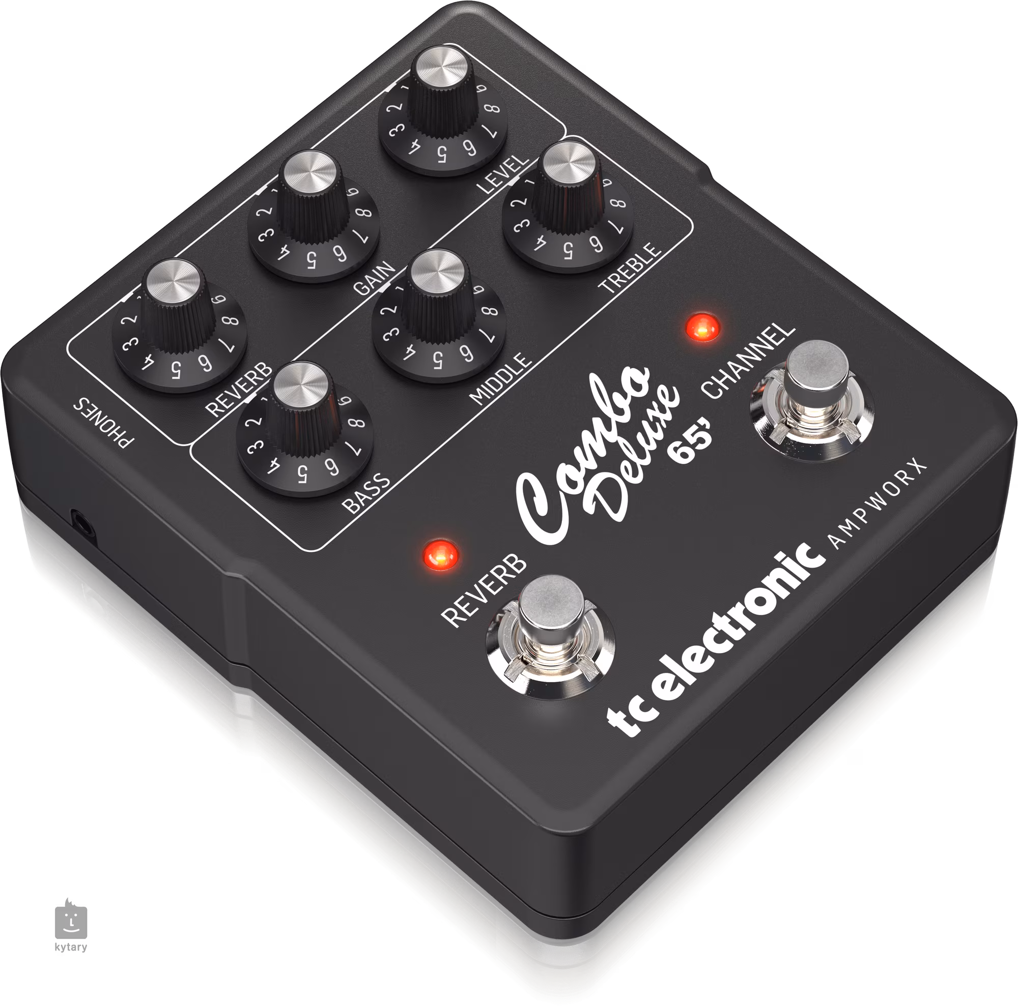 TC Electronic COMBO DELUXE 65' Preamp to dwukanałowy przedwzmacniacz w formacie efektu pedałowego, który wiernie oddaje brzmienie gitary Blackface Reverb Deluxe z 1965 roku. Posiada dwa kanały w klasycznym podziale Clean i More Gain/Crunch, regulatory w postaci trójpasmowego EQ i przełącznika Bright, potencjometry Gain i Level oraz oddzielną sekcję efektu reverb (próbkowaną z oryginalnego pogłosu sprężynowego Reverb Deluxe z 1965 roku) z regulacją intensywności efektu (Reverb) i EQ (Reverb Tone). Ustawienie kanału jest automatycznie zapisywane po jego przełączeniu.