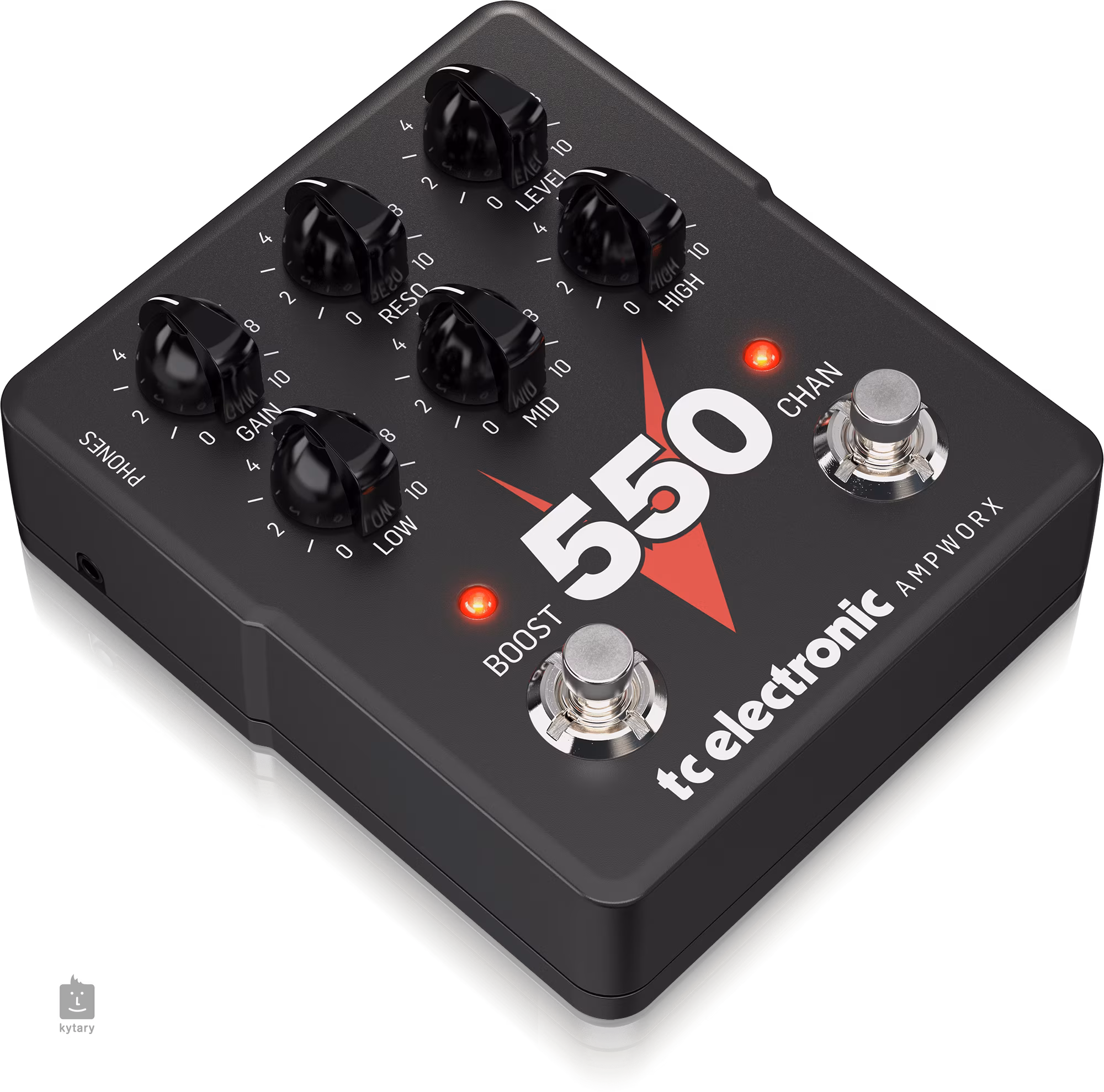 TC Electronic V550 Preamp to dwukanałowy przedwzmacniacz w formacie efektu pedałowego, który wiernie oddaje brzmienie słynnego wzmacniacza lampowego 5150 o wysokim wzmocnieniu. Posiada dwa kanały Green (Crunch) i Red (Lead/High Gain), które niezawodnie pokrywają spektrum dźwięków muzyki rockowej i metalowej, trzypasmowy korektor (Bass, Mid, Treble) uzupełniony o kontrolę Presence i Resonance oraz kontrolę poziomu sygnału wyjściowego. Ustawienia kanałów są automatycznie zapisywane po przełączeniu.