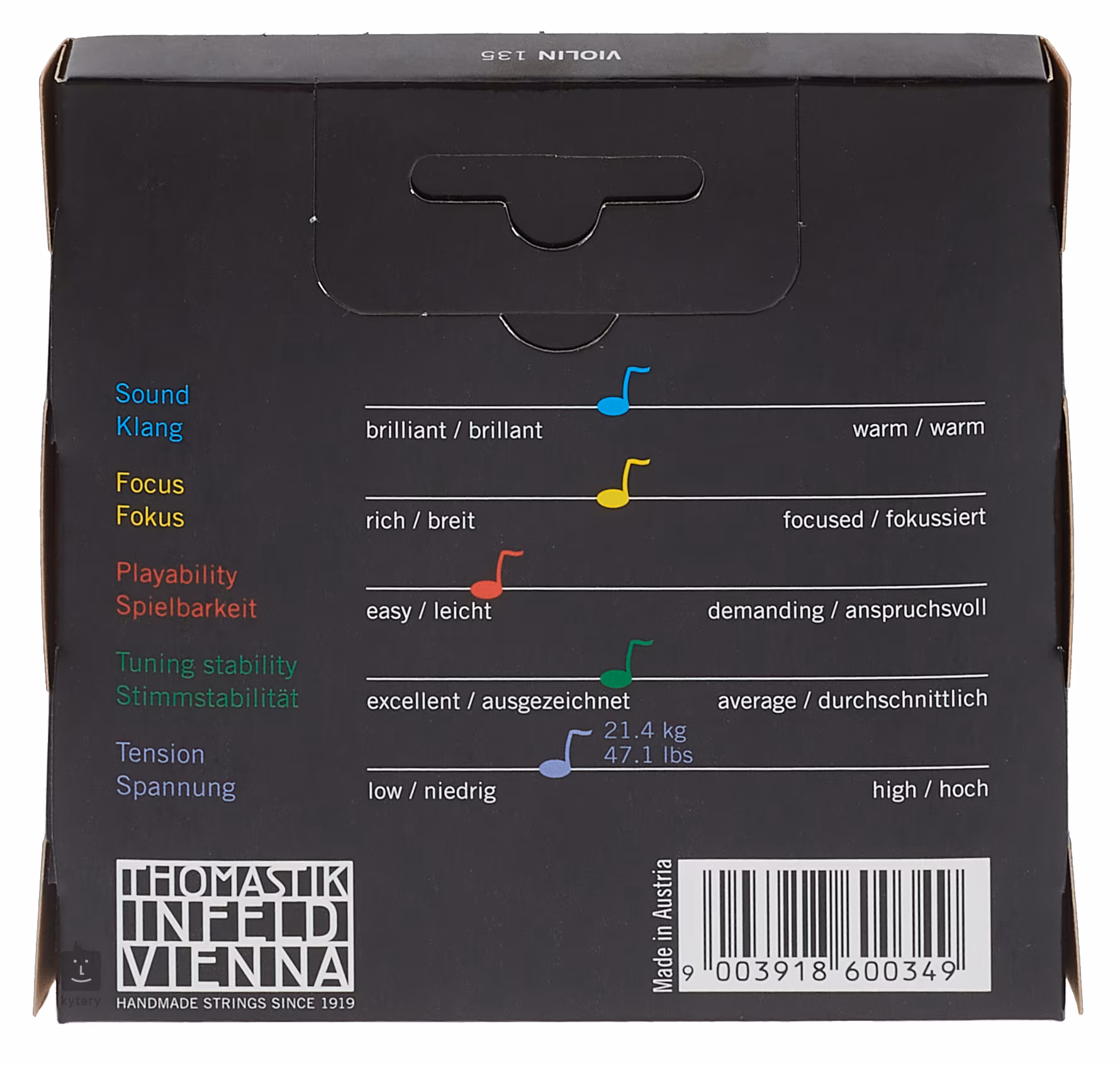 Struny Thomastik Dominant oferują muzykom zalety wynikające z zastosowania syntetycznego rdzenia. Ich brzmienie jest cieplejsze, a podczas gry są podobne do prawdziwych strun jelitowych. Ponadto są one całkowicie odporne na zmiany wilgotności i temperatury, dzięki czemu ich strojenie jest niezwykle stabilne. Dźwięk jest bardziej miękki, czysty i bardzo bogaty w harmonię. Struny te są odpowiednie jako odskocznia w poszukiwaniu swojego charakterystycznego brzmienia.