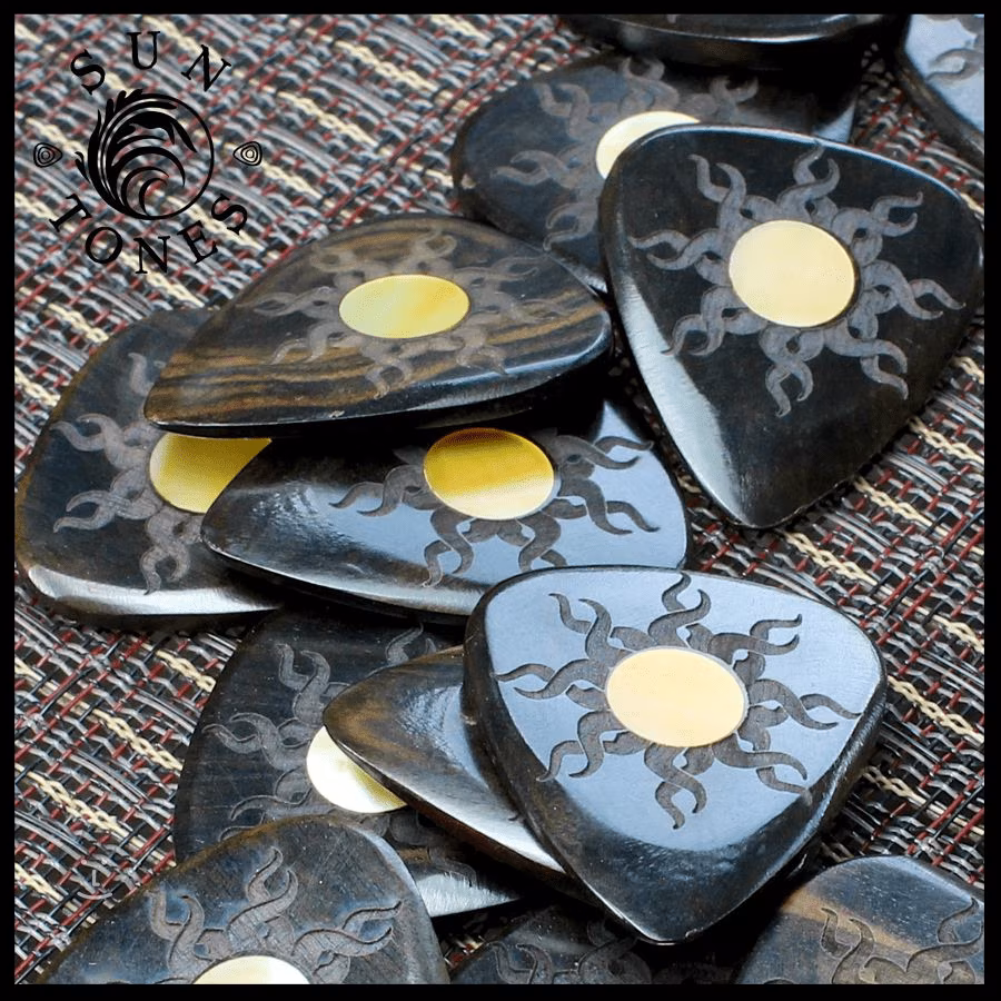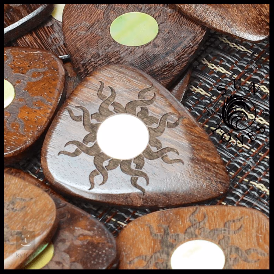 Niezależnie od tego, czy szukasz prezentu dla entuzjasty muzyki, czy po prostu szukasz idealnego brzmienia i chcesz wypróbować picki wykonane z nietypowych materiałów, z pewnością znajdziesz to, czego potrzebujesz w Timber Tones. Kostki Timber z serii Sun Tones wykonane są z twardego drewna, które wydobywa z gitary wyraźne, czyste tony wysokie. Heban afrykański, makassar i malezyjski charakteryzują się wyjątkową twardością, która jest szczególnie odpowiednia do gry na gitarze elektrycznej. To samo dotyczy drewna jodły indyjskiej. Podstrunnice mają grubość 2,5 mm, która zwęża się do 0,7 mm w kierunku końcówki. Laserowo wycięty motyw słońca nadaje im nie tylko stylowy wygląd, ale także pewny, antypoślizgowy uchwyt.