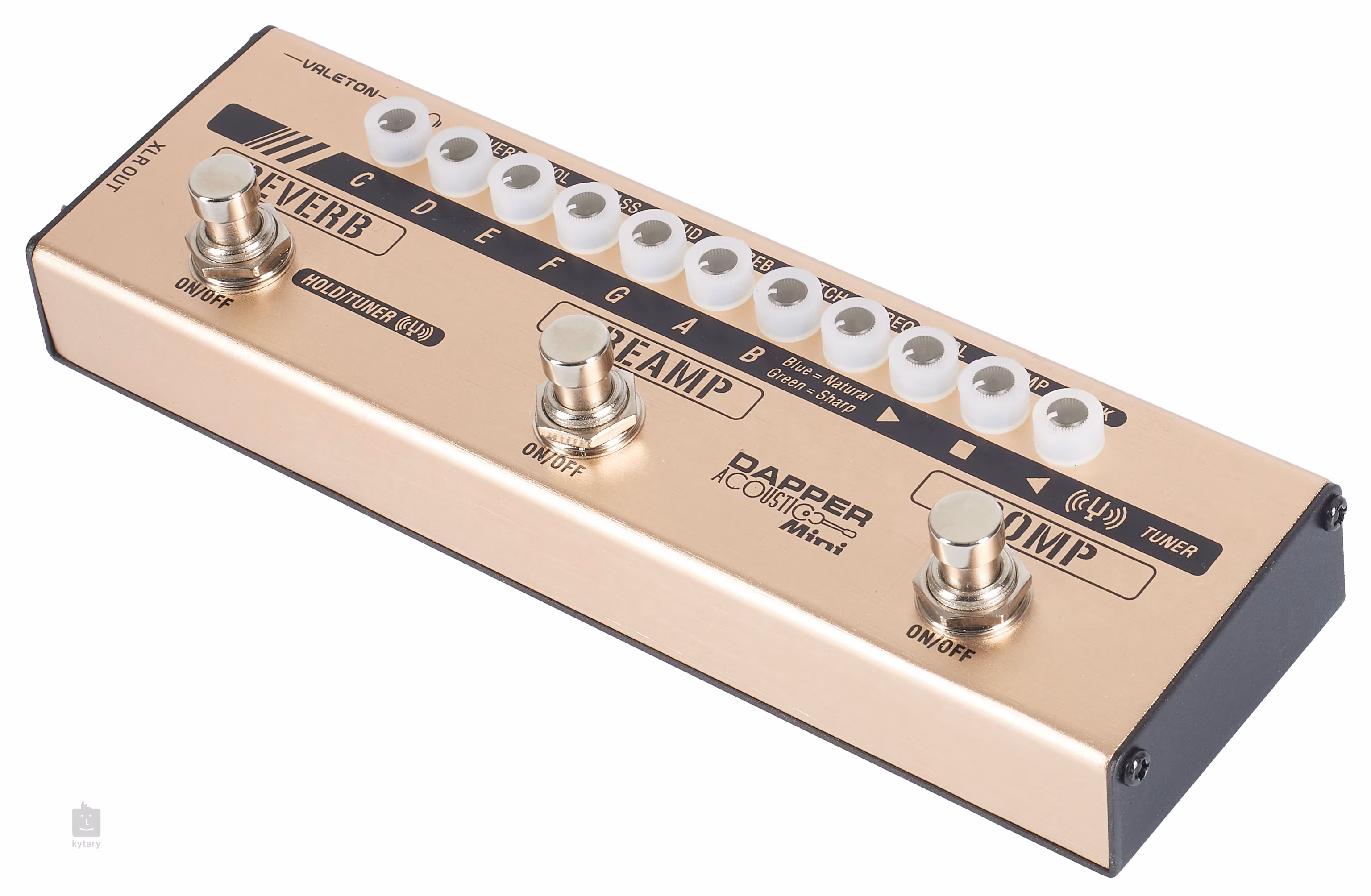 Dapper Acoustic Mini to niewielki podłogowy multiefekt do gitary akustycznej z intuicyjnym interfejsem użytkownika i trzema oddzielnymi sekcjami efektów - kompresorem z regulowanym stopniem i intensywnością kompresji, przedwzmacniaczem z trzypasmowym korektorem i kontrolkami do zwalczania niepożądanych efektów sprzężenia zwrotnego oraz sekcją efektu Reverb z jednym pokrętłem. Efekt podłogowy oferuje również zintegrowany tuner, zbalansowane wyjście XLR do wysyłania sygnału do miksera lub karty dźwiękowej lub wyjście słuchawkowe z własną regulacją głośności wyjściowej i symulacją kabiny. Do zasilania multiefektu wykorzystywany jest zasilacz 9V.