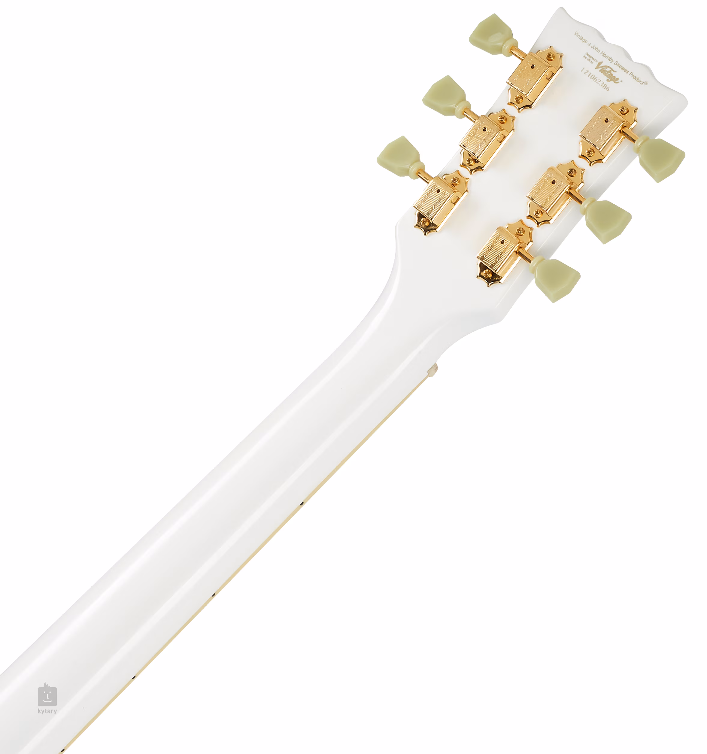 Vintage V100AW to stylowa gitara elektryczna w stylu LP single-cut z serii Vintage Reissued Series. Mahoniowy korpus pokryty jest mahoniowym topem i wykończeniem w kolorze Arctic White. Do mahoniowego gryfu o przyjemnym profilu „soft C” przyklejony jest palisandrowy podstrunnica z dwudziestoma progami rozmiaru Medium Jumbo. Dwa humbuckery marki Wilkinson zapewniają gitarze naprawdę soczyste brzmienie, które może być zarówno agresywnie rockowe, jak i ciepło bluesowe. Jego kontury można regulować za pomocą pokręteł głośności, tonu i trzypozycyjnego przełącznika przetworników. Dzięki temu można dostosować ustawienia dokładnie do swoich potrzeb. Struny są zamocowane przez zerowy prog GraphTech Nubone w niezawodnych mechanizmach strojących marki Grover oraz w mostku Wilkinson TOM i strunociągu. Gitary elektryczne firmy Vintage oferują za bardzo atrakcyjną cenę doskonałą jakość wykonania i parametry, które można znaleźć nawet w znacznie droższych modelach. Jest to doskonały wybór dla początkujących gitarzystów, ale dzięki brzmieniu i komfortowi gry docenią je również zaawansowani muzycy.