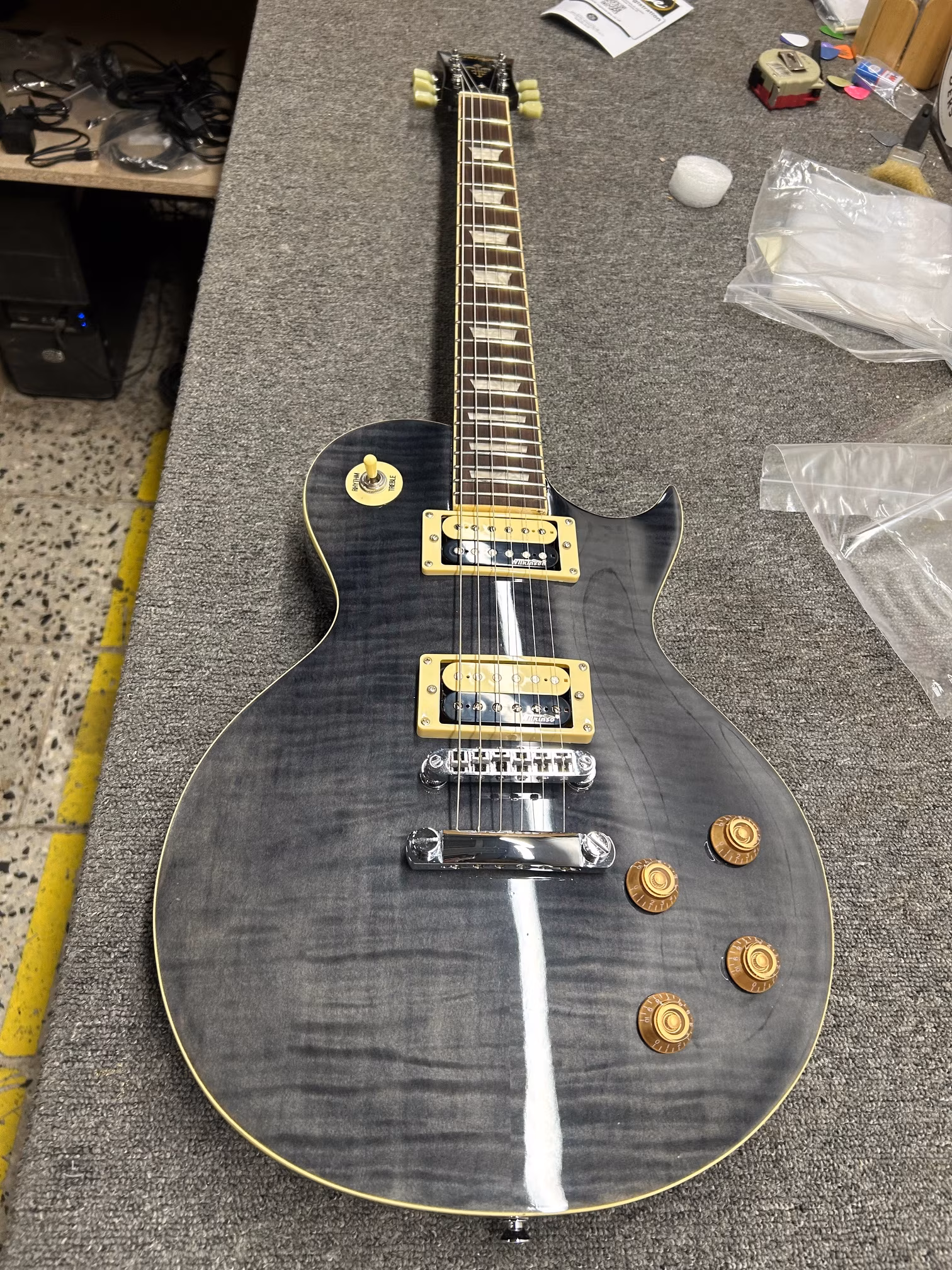 Korpus z litego mahoniu jest ozdobiony pięknym topem z klonu płomienistego i imponującym wykończeniem Flamed Thru Black. Klejona mahoniowa szyjka połączona jest z kompozytową podstrunnicą z drewna z dwudziestoma dwoma progami.