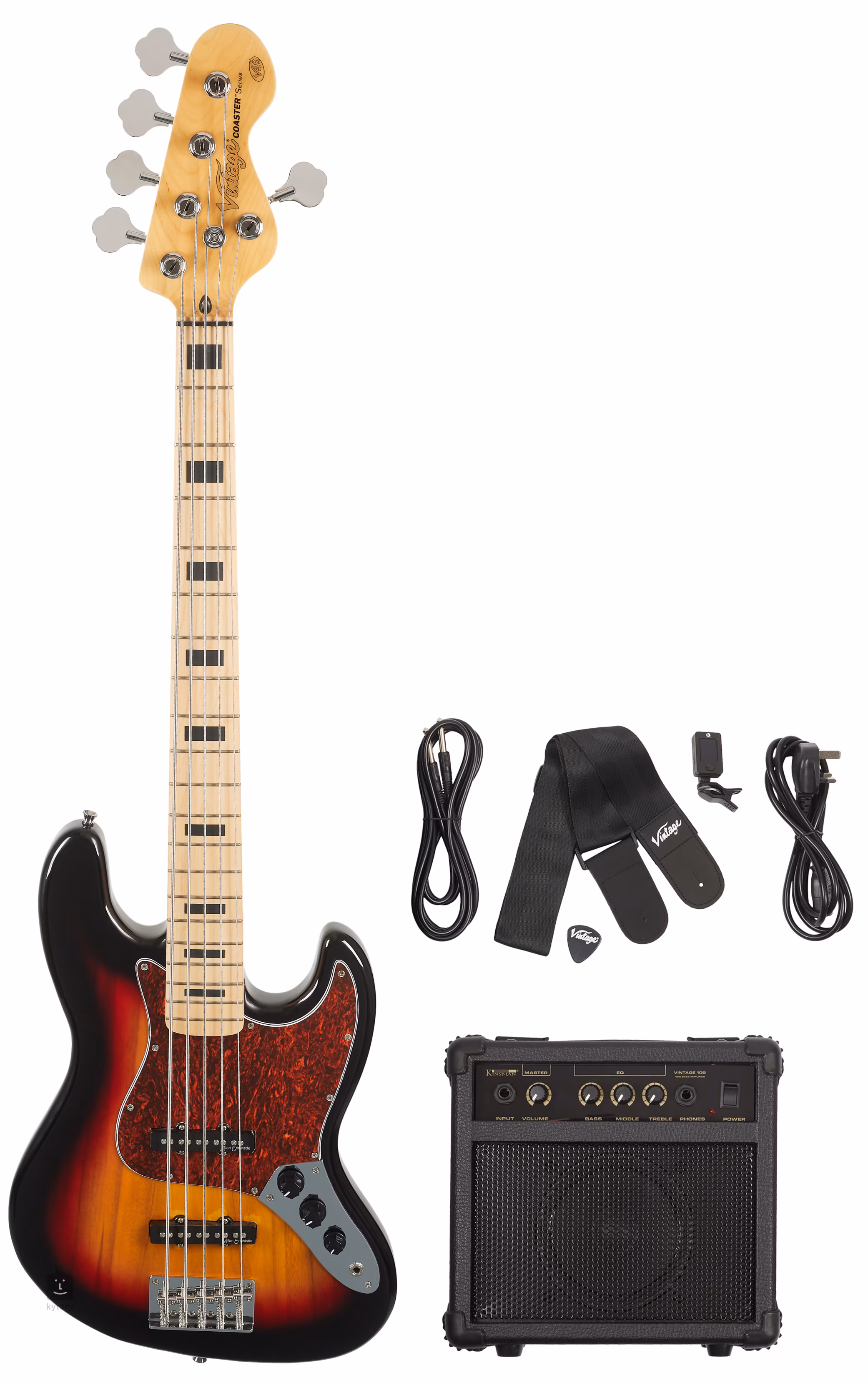 Vintage Coaster V495 to idealny wybór jako pierwszy "poważny" bas dla entuzjastów rocka, w tym przypadku w kompletnym pakiecie, którego muzyk potrzebuje na całe życie. Oprócz basu, pakiet zawiera pick, pasek, zestaw strun, futerał, kabel, przypinany tuner i wzmacniacz Kinsman 10W z Master Volume i 3-pasmowym korektorem, co czyni go dobrze wyposażonym zestawem dla aspirujących muzyków w każdym wieku.