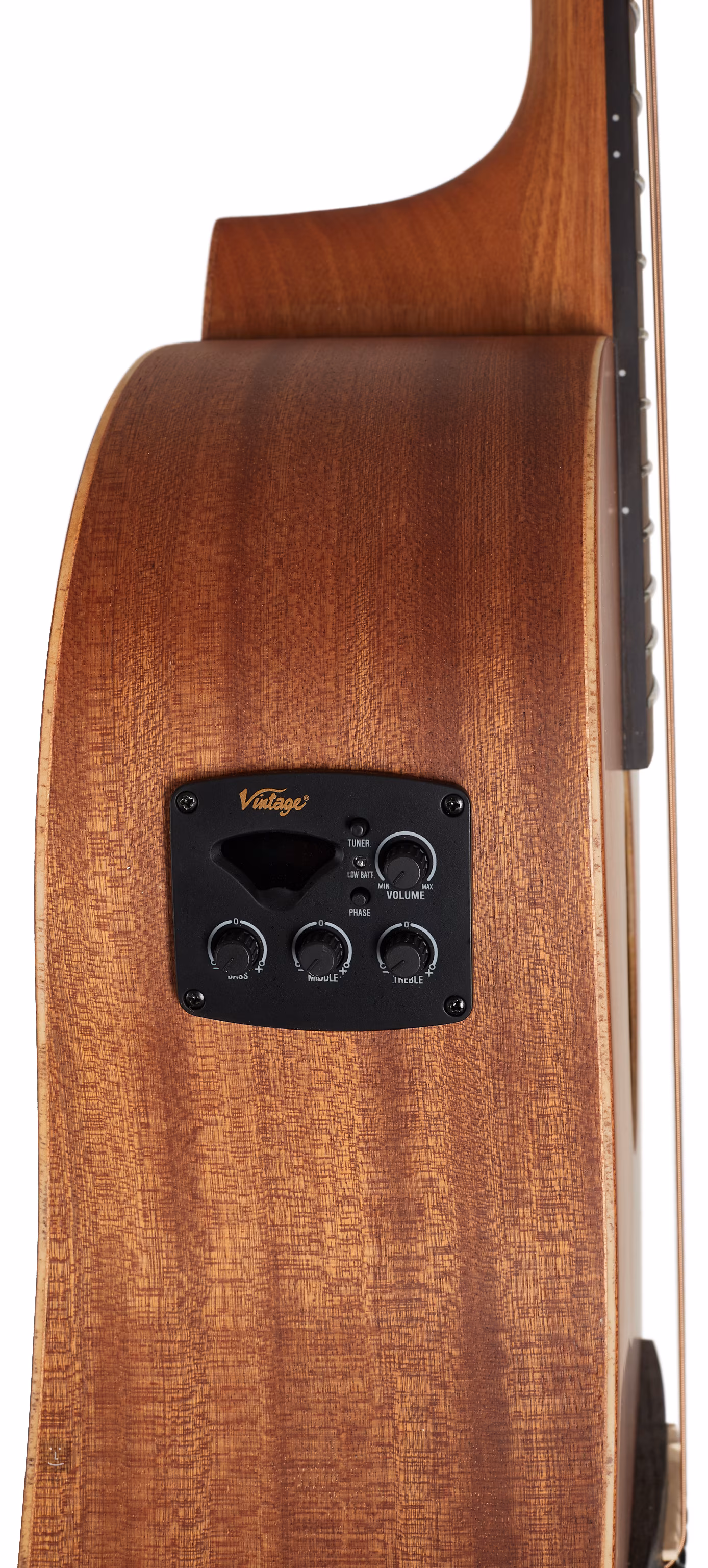 Gitary elektroakustyczne Vintage z serii Mahogany posiadają korpus wykonany z laminowanego mahoniu oraz satynowe wykończenie, które podkreśla naturalne usłojenie drewna.