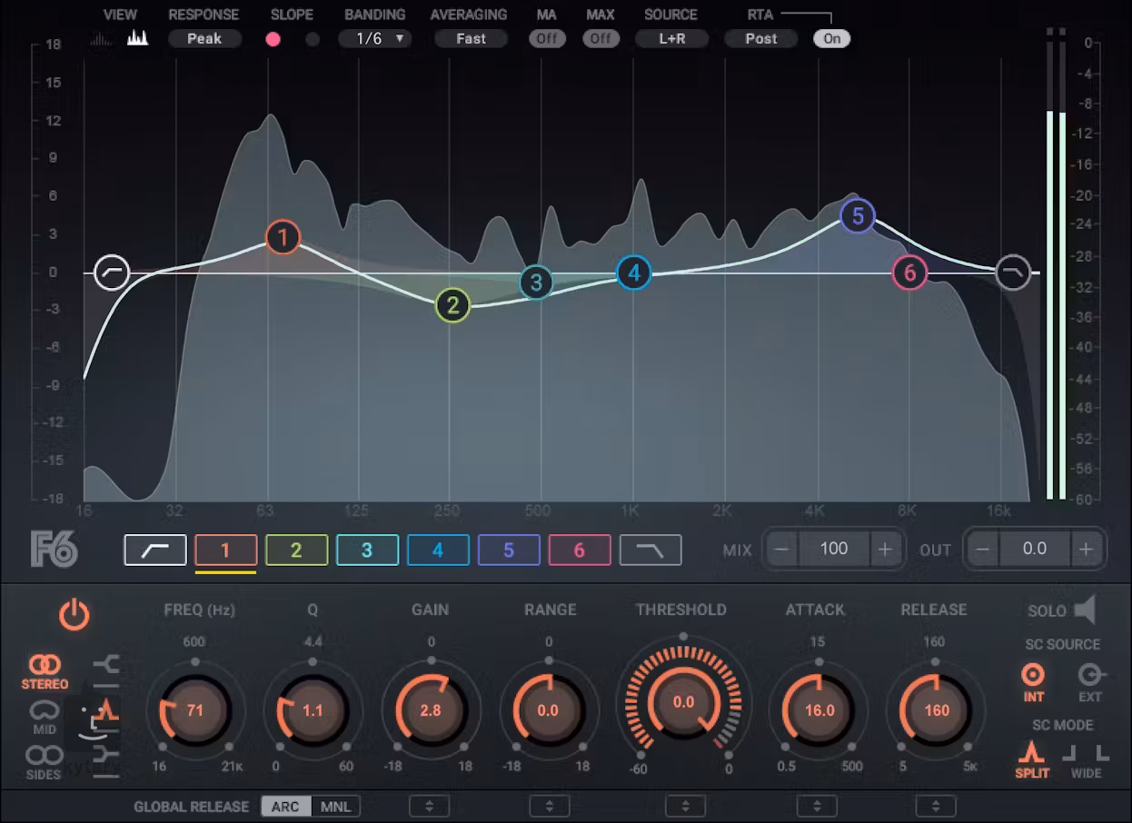 F6 Floating-Band Dynamic EQ od Waves to zaawansowany dynamiczny korektor, który umożliwia precyzyjną i elastyczną korekcję przy użyciu sześciu dowolnych pasm. Wtyczka ta oferuje zaawansowaną kontrolę EQ i kompresji/rozszerzenia dla każdego pasma, opcje przetwarzania po stronie środkowej oraz analizator widma częstotliwości w czasie rzeczywistym. F6 idealnie nadaje się do izolowania konkretnych problemów na poszczególnych ścieżkach, umożliwiając przejrzystą regulację tylko wtedy, gdy jest to konieczne.