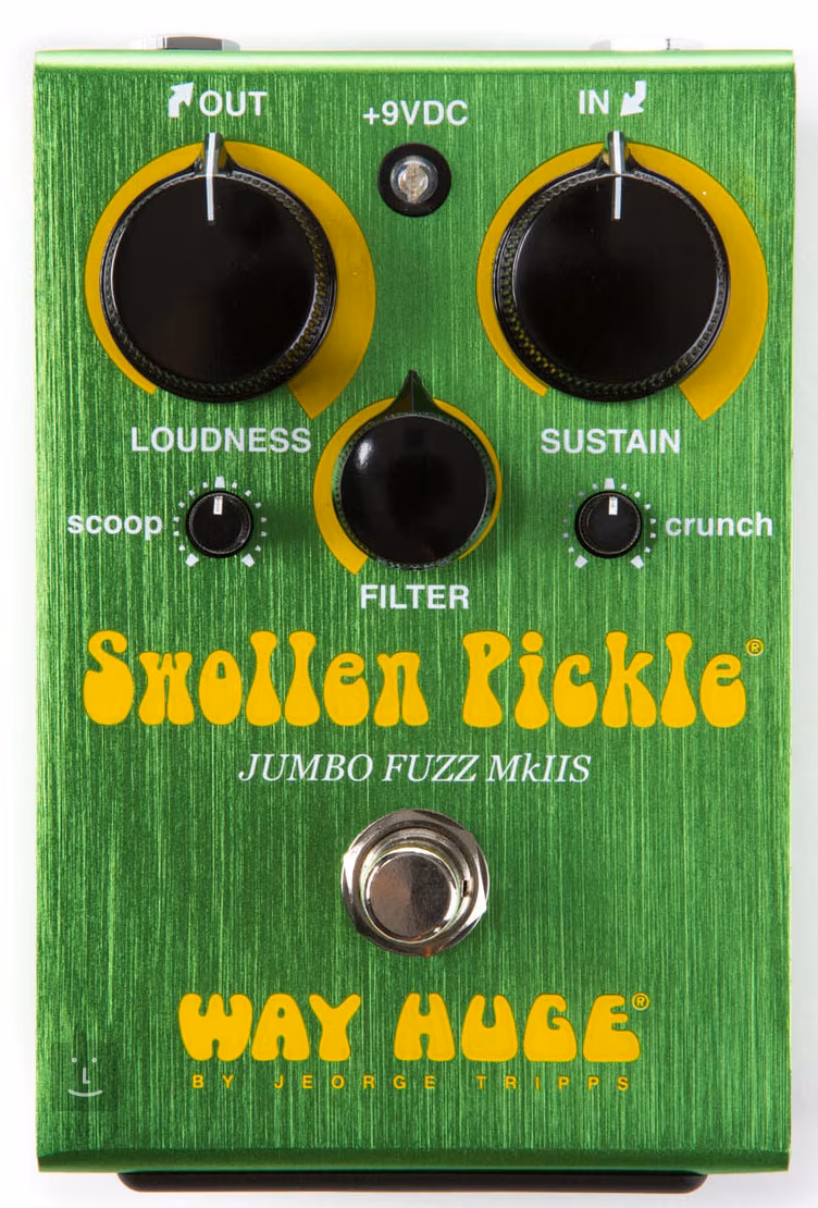 Efekt pedalboardowy Swollen Pickle Jumbo Fuzz MkIIS firmy Way Huge oferuje ten sam wysokiej jakości fuzz o wysokim wzmocnieniu, co jego większy brat, MkII, w formacie przyjaznym dla pedalboardów. Ciepły vintage fuzz z subtelnym podbiciem, masywny fuzz o wysokim wzmocnieniu lub całkowicie lo-fi dźwięki - wszystko to można łatwo regulować za pomocą pięciu regulatorów pedału określających głośność wyjściową, zniekształcenie / sustain, intensywność kompresji i korektor ze szczególnym naciskiem na średnie częstotliwości. A jeśli to nie wystarczy dla niektórych "tweakerów", pudełko oferuje dwa wewnętrzne elementy sterujące - Voice określa zakres częstotliwości kontroli Scoop, Clip przełącza między dwoma rodzajami przycinania.