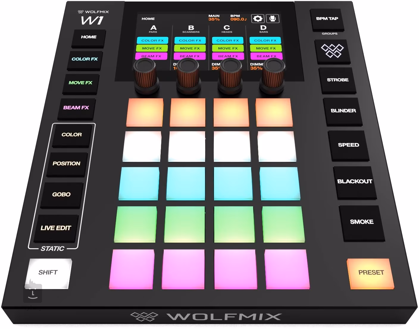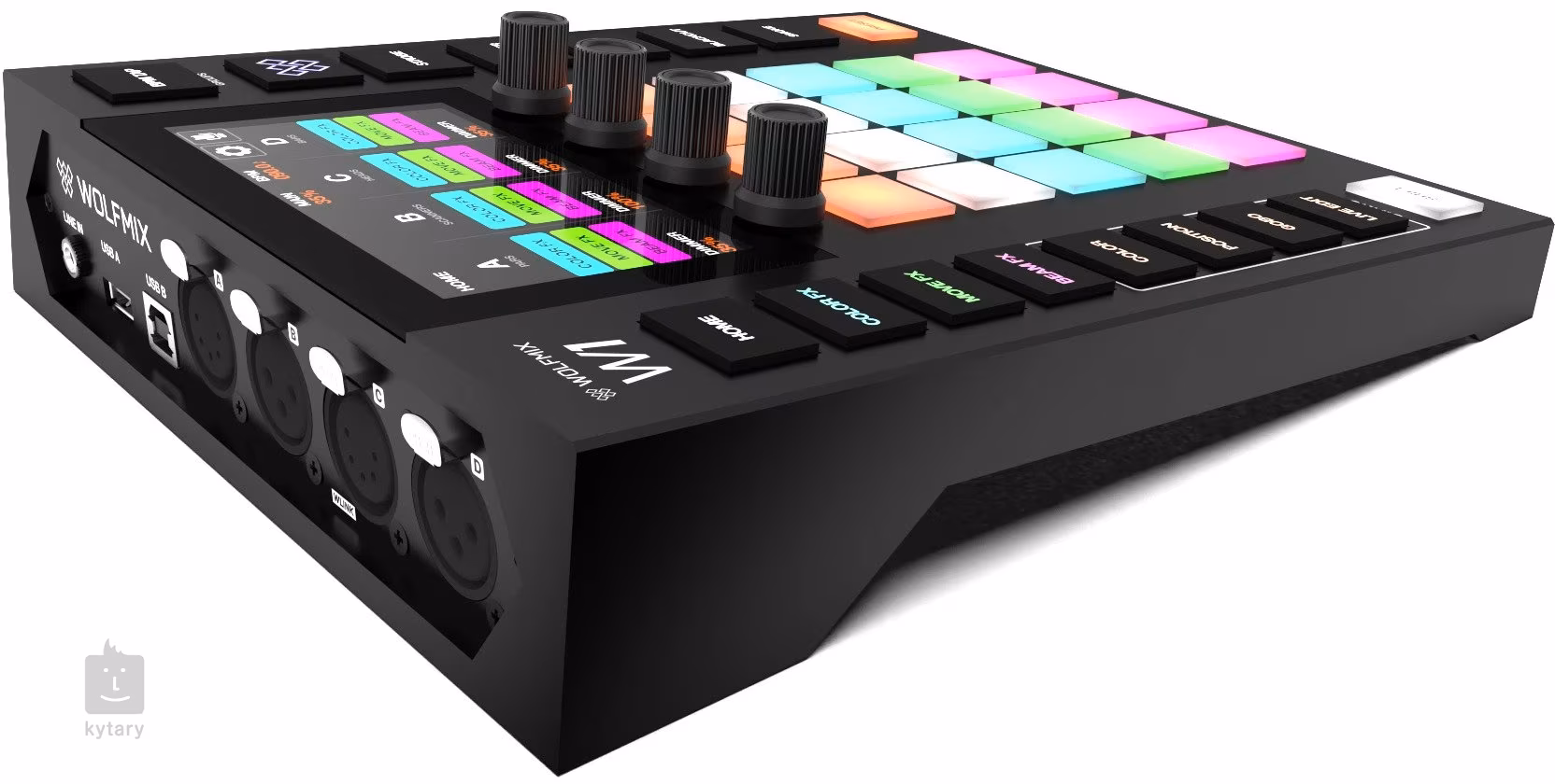 Obsługa jest niezwykle przejrzysta i szybka dzięki 4,3-calowemu ekranowi dotykowemu, 37 podświetlanym przyciskom silikonowym oraz 4 enkodersom obrotowym, które umożliwiają precyzyjną regulację parametrów w czasie rzeczywistym. Wolfmix zawiera zaawansowane moduły, takie jak Color FX, Move FX i Beam FX, dzięki którym można tworzyć dynamiczne efekty świetlne, ruchy głowic lub złożone sekwencje chase. Nie brakuje również sekwencera krokowego, palet kolorów, pozycji i gobów oraz możliwości zapisania nawet 200 presetów.