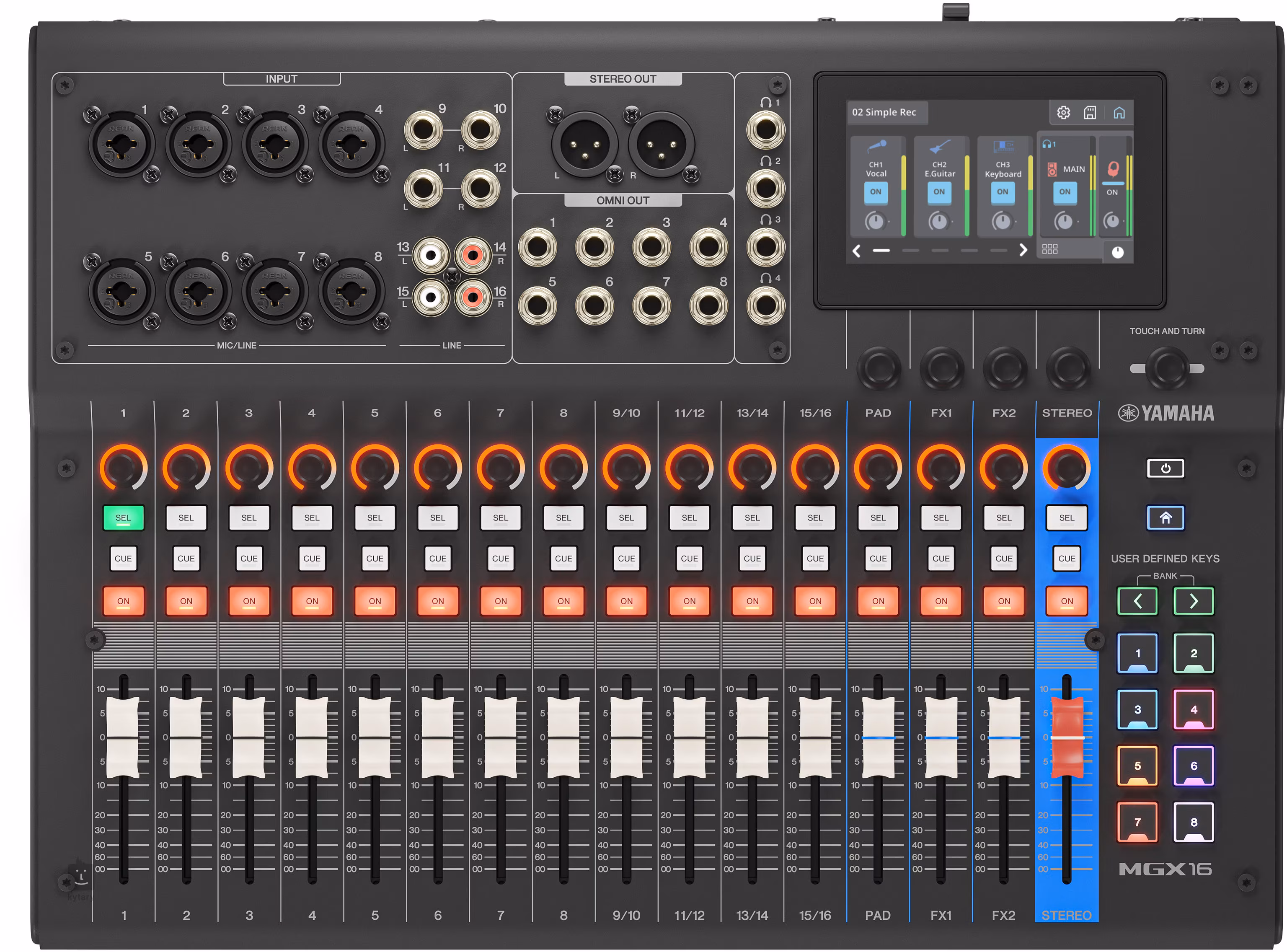 Osiem konfigurowalnych padów i cztery regulatory użytkownika można skonfigurować w czterech bankach – do uruchamiania dźwięków, scen lub tonów testowych. MGX16 działa więc nie tylko jako cyfrowy mikser, ale także jako centrum kreatywne dla nowoczesnej produkcji. Mimo to zachowuje wagę zaledwie 4,7 kg, co czyni go idealnym rozwiązaniem przenośnym bez kompromisów w zakresie wytrzymałości.