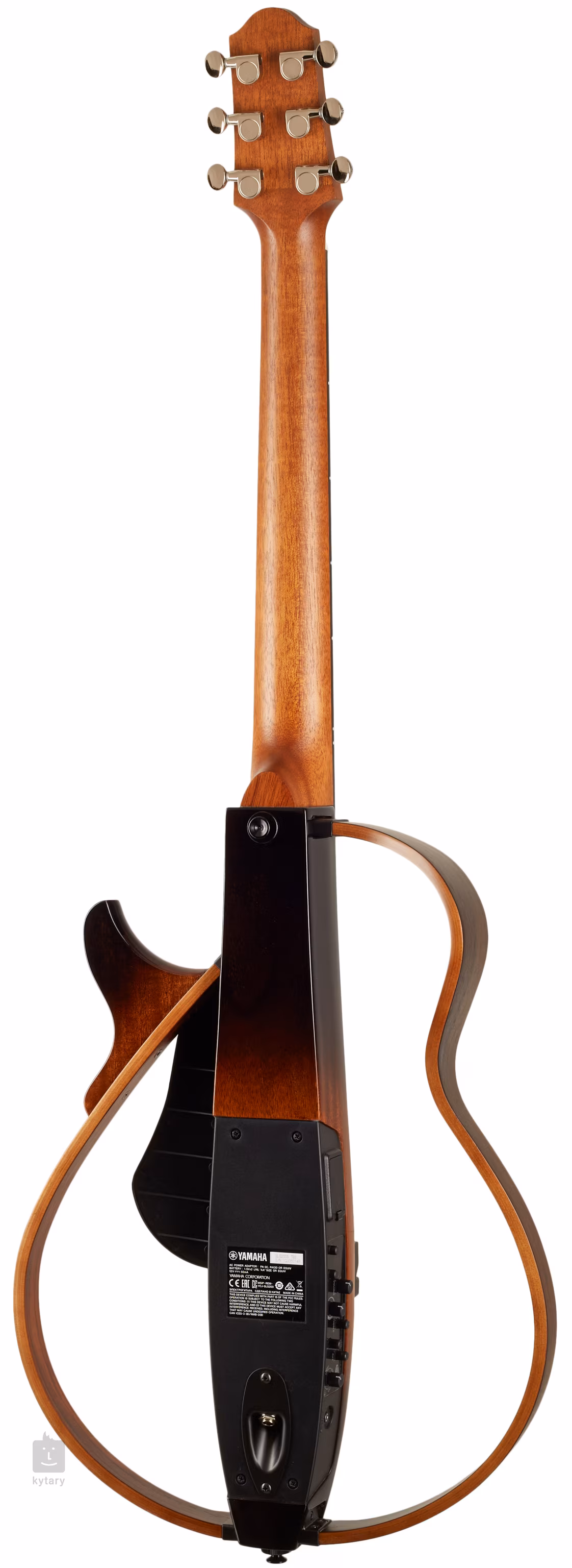 Gitara SIlent może być zasilana bateriami (2x AA) lub za pomocą zasilacza 9-12V DC (center positive) np. Yamaha PA-3C, PA-130 (A, B). Adapter nie jest dołączony do zestawu.