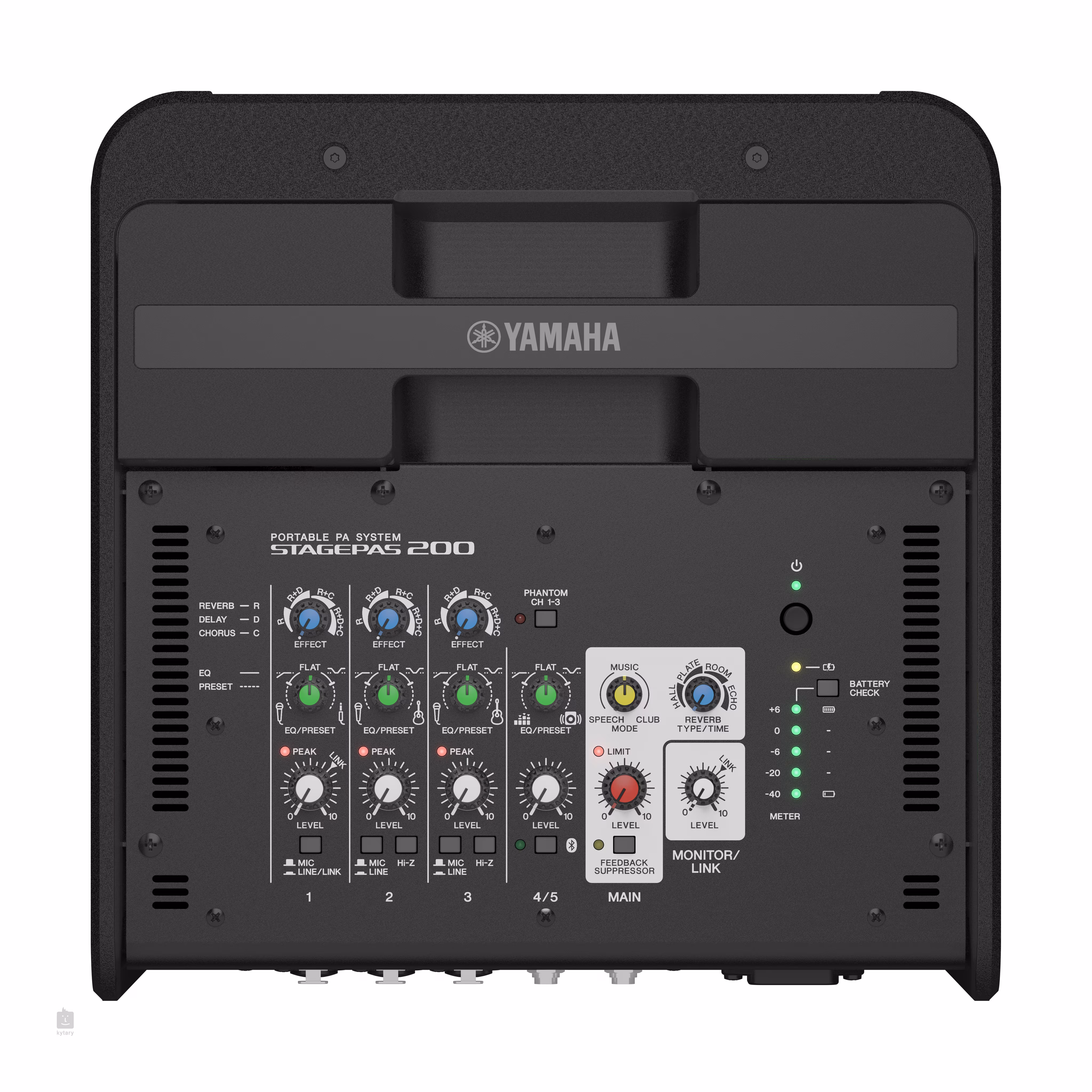 Yamaha STAGEPAS 200BTR to przenośny system nagłośnieniowy wyposażony we wzmacniacz klasy D o mocy 180 W, ośmiocalowy głośnik niskotonowy, 1,4-calowy przetwornik, pięciokanałowy miks cyfrowy (3x mono mic/line, 1x stereo line), łączność Bluetooth, zdalne sterowanie za pomocą aplikacji STAGEPAS Controller (iOS, Android) oraz wbudowany akumulator litowo-jonowy o dużej pojemności (2700 mAh, 29.6 V) zapewniający do 10 godzin pracy na jednym ładowaniu (czas ładowania wynosi około 4 godzin).