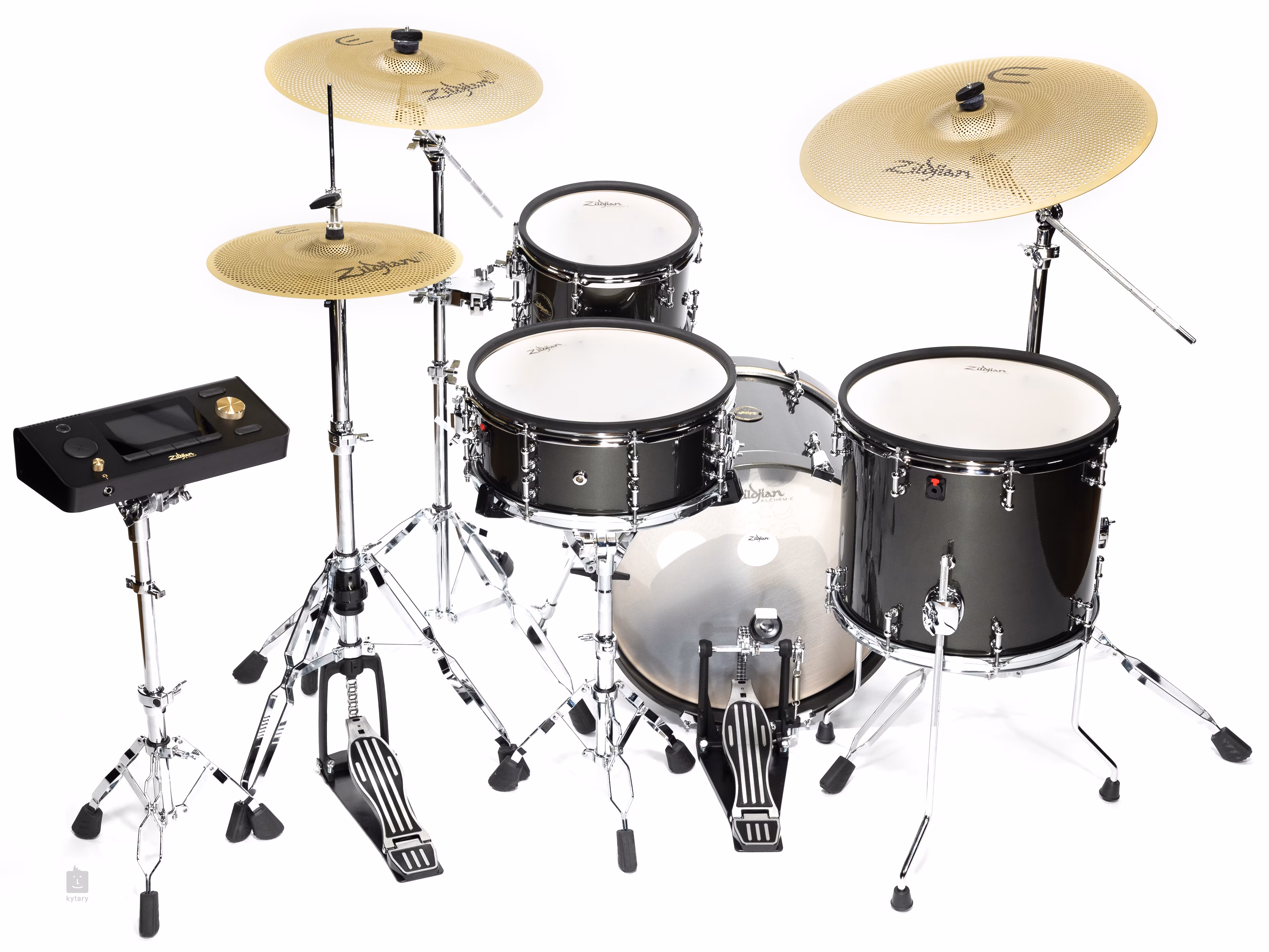 Firma Zildjian przedstawia zupełnie nową serię elektronicznych zestawów perkusyjnych ALCHEM-E Series, które zapewniają wyjątkowe i wciągające wrażenia podczas gry. Seria ta obejmuje zarówno bardziej kompaktowy model Bronze EX, jak i flagowy model ALCHEM-E Gold EX. Każdy zestaw jest wyposażony w rewolucyjne talerze Zildjian E-FAMILY oraz w pełni wyposażony moduł perkusyjny Zildjian E-VAULT (ZEV1), który zapewnia najwyższą czułość i reakcję dzięki najnowocześniejszej konfiguracji. Niezależnie od tego, czy jesteś początkującym perkusistą, czy doświadczonym profesjonalistą, seria ALCHEM-E oferuje rozwiązania dla każdego. Zestawy ALCHEM-E Series mogą pochwalić się pełnowymiarowymi bębnami akustycznymi z siedmiowarstwowymi korpusami z klonu północnoamerykańskiego, które zapewniają maksymalne wrażenia akustyczne i estetykę na scenie. Dzięki łatwemu przejściu z zestawu elektronicznego na akustyczny, gdzie wystarczy tylko wymienić siatkowe membrany na akustyczne membrany rezonansowe i wyregulować kilka śrub, perkusje te zapewniają prawdziwie hybrydowe wrażenia. Talerze i moduł perkusyjny są produkowane w odlewni w Norwell w stanie Massachusetts i wyposażone w zaawansowaną technologię czujników, która zapewnia doskonałą czułość i reakcję. Zildjian E-VAULT, nowy elektroniczny moduł perkusyjny, zapewnia rewolucyjną autentyczność dźwięku, która całkowicie Cię pochłonie. Moduł oferuje obszerną bibliotekę wysokiej jakości dźwięków perkusji, talerzy i instrumentów perkusyjnych oraz umożliwia dostęp do prawie całego katalogu talerzy Zildjian. Użytkownicy mogą tworzyć i aktualizować swoje idealne zestawy oraz dostosowywać osobisty dźwięk za pomocą intuicyjnej nawigacji i wysokiej jakości 5-calowego kolorowego ekranu dotykowego. Zestawy ALCHEM-E, wyposażone w talerze Zildjian E-FAMILY, zapewniają nie tylko dynamiczne i realistyczne wrażenia, ale także doskonałe możliwości kreatywnej gry i nagrywania. Zestaw składa się z 18-calowej stopy, 14-calowego floru, 14-calowego werbla, 10-calowego tomu i trzech talerzy - 14-calowego hi-hat, 16-calowego crash i 20-calowego ride. Oczywiście w zestawie znajduje się również osprzęt. W opakowaniu nie ma natomiast stołka perkusyjnego, statywów do hi-hat i werbla oraz pedału do bębna basowego. Po zakupie zestawu perkusyjnego należy zaktualizować moduł na stronie internetowej firmy Zildjian, gdzie znajduje się również przejrzysta instrukcja.