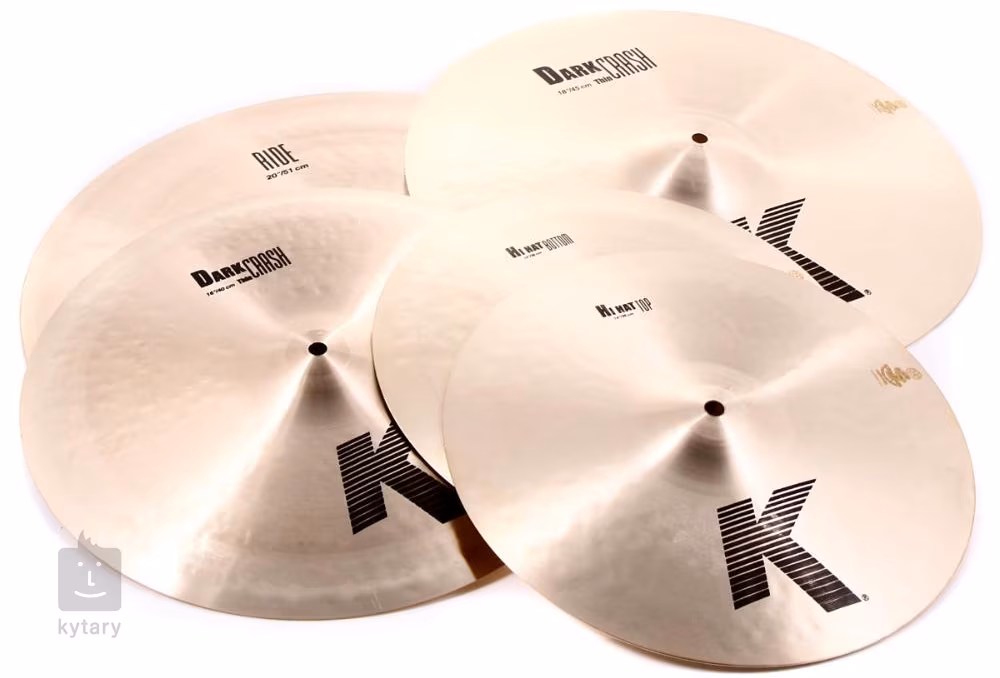 Opakowanie zawiera zestaw talerzy z serii K: 20" K Ride, 14" K HiHat, 16" K Dark Thin Crash i 18" K Dark Crash Thin.