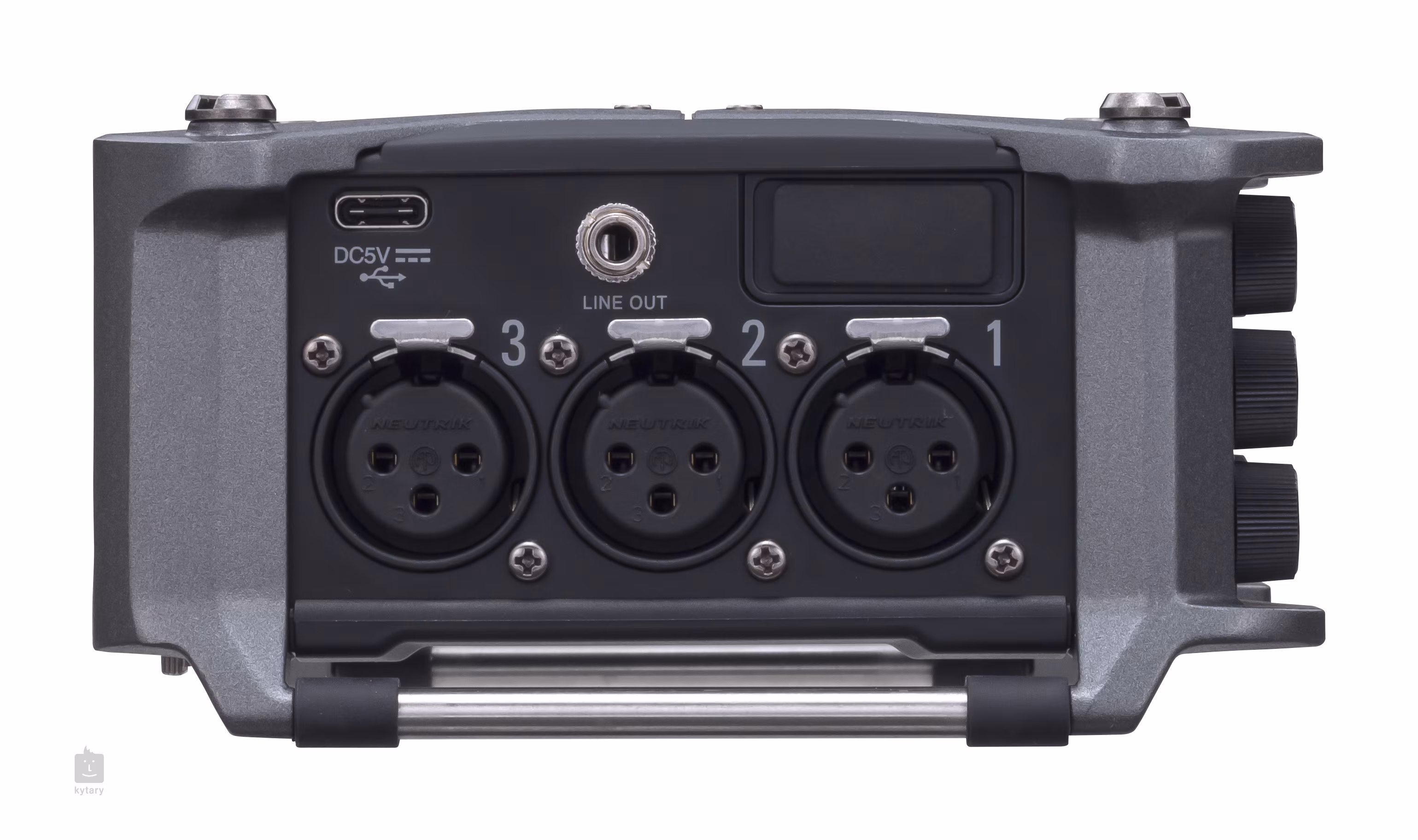 Zoom F6 nagrywa pliki na kartę SD o pojemności do 512 GB, a z tyłu znajduje się również gniazdo na cztery baterie AA, które wystarczają na 7,5 godziny pracy. W zestawie znajduje się mocowanie kamery.